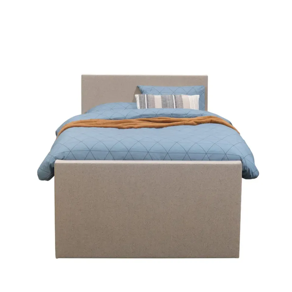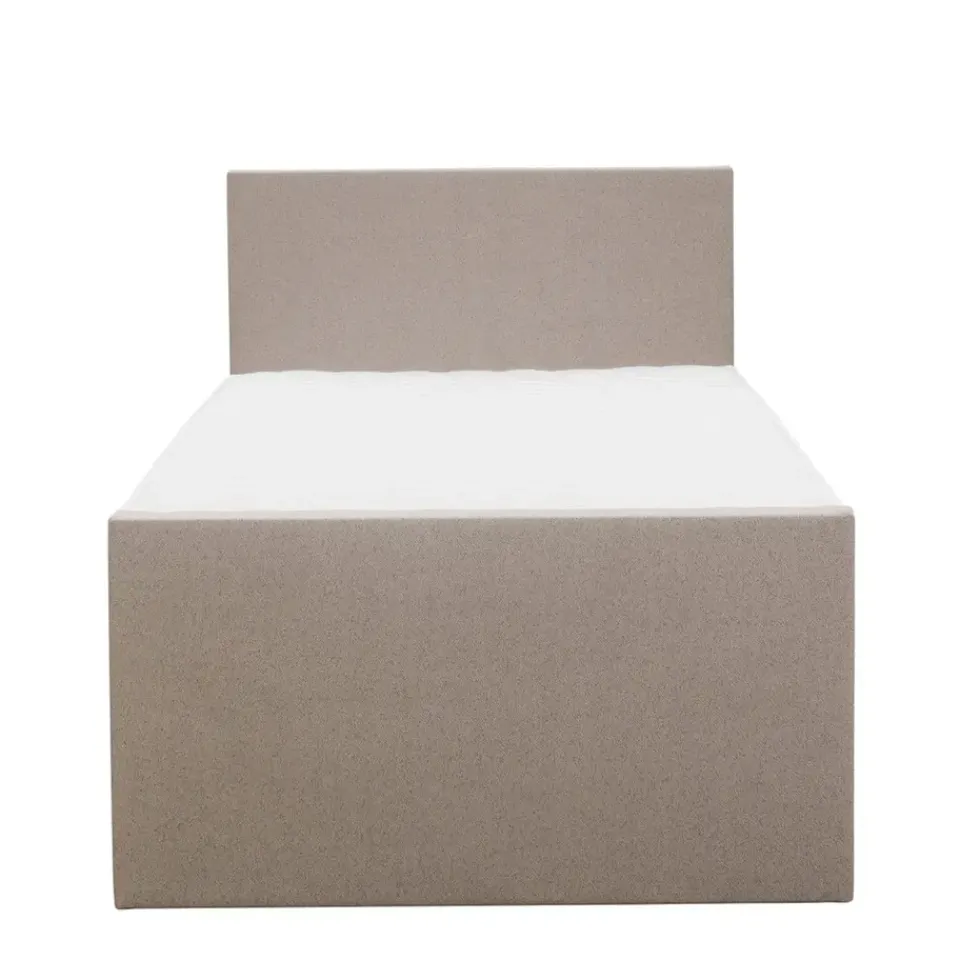 Boxspring met opbergruimte Liv is een boxspring met een afmeting van 120×200 cm. Deze prachtige boxspring is bekleed met een grof geweven beige stof en heeft een strakke uitstraling met een egaal hoofd- en voetbord. De Liv egaal is uitgerust met een pocketveringmatras en daarnaast ook nog een koudschuim topdekmatras voor extra comfort. Het pocketveringmatras is omkeerbaar, bestaande uit zowel een medium- als een stevige kant. Hierdoor kun je zelf kiezen wat voor jou het meest comfortabel ligt.