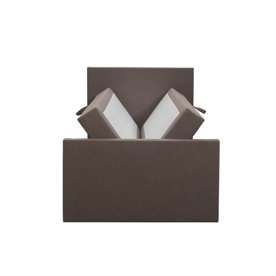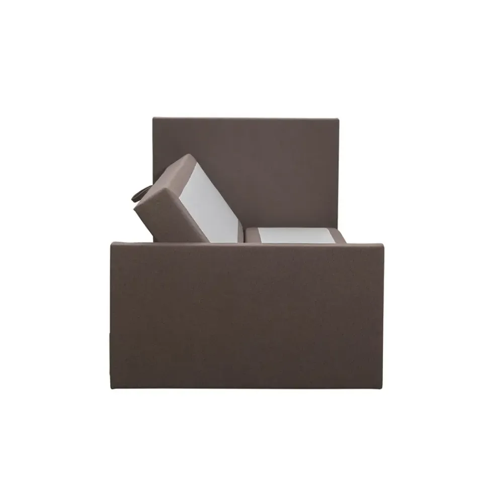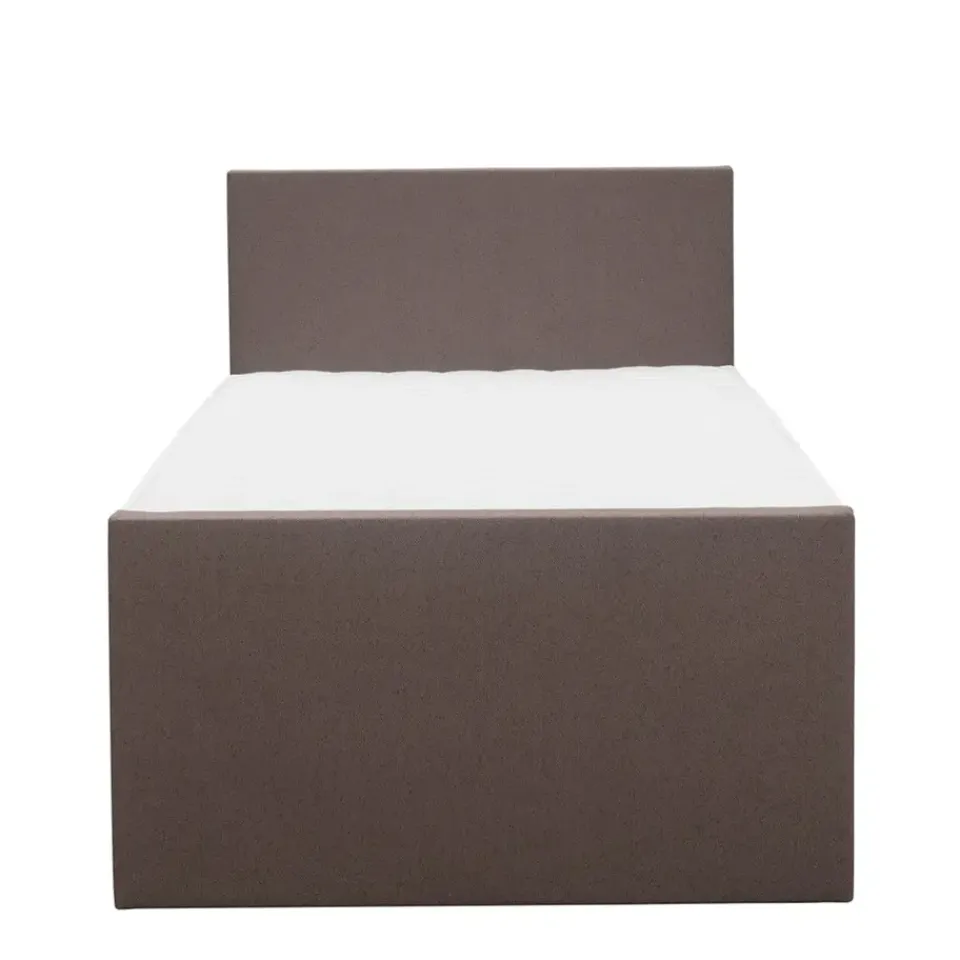 Boxspring met opbergruimte Liv is een boxspring met een afmeting van 120×200 cm. Deze prachtige boxspring is bekleed met een grof geweven donkerbruine stof en heeft een strakke uitstraling met een egaal hoofd- en voetbord. De Liv egaal is uitgerust met een pocketveringmatras en daarnaast ook nog een koudschuim topdekmatras voor extra comfort. Het pocketveringmatras is omkeerbaar, bestaande uit zowel een medium- als een stevige kant. Hierdoor kun je zelf kiezen wat voor jou het meest comfortabel ligt.