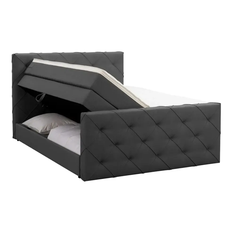 Boxspring met opbergruimte Liv is een boxspring met een afmeting van 160×200 cm. Deze prachtige boxspring is bekleed met een grof geweven antraciete stof en heeft een romantische uitstraling met een geruit hoofd- en voetbord. De Liv geruit is uitgerust met twee pocketveringmatrassen en daarnaast ook nog een koudschuim topdekmatras voor extra comfort. Het pocketveringmatras is omkeerbaar, bestaande uit zowel een medium- als een stevige kant. Hierdoor kun je zelf kiezen wat voor jou het meest comfortabel ligt.