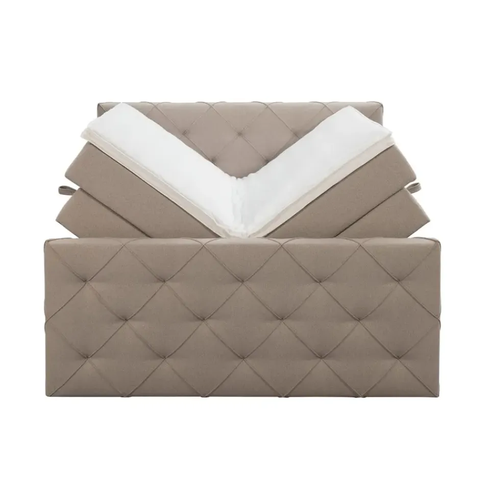 Boxspring met opbergruimte Liv is een boxspring met een afmeting van 140×200 cm. Deze prachtige boxspring is bekleed met een grof geweven beige stof en heeft een romantische uitstraling met een geruit hoofd- en voetbord. De Liv geruit is uitgerust met pocketveringmatrassen en daarnaast ook nog een koudschuim topdekmatras voor extra comfort. Het pocketveringmatras is omkeerbaar, bestaande uit zowel een medium- als een stevige kant. Hierdoor kun je zelf kiezen wat voor jou het meest comfortabel ligt.