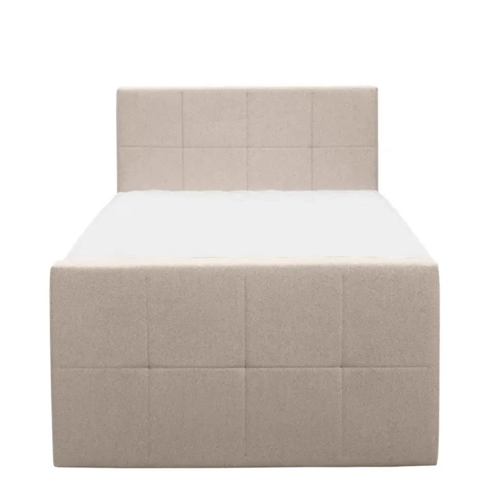 Boxspring Liv is een boxspring met een afmeting van 120×200 cm. Deze prachtige boxspring is bekleed met een grof geweven beige stof en heeft een landelijke uitstraling met een geblokt hoofd- en voetbord. De Liv geblokt is uitgerust met een pocketveringmatras en daarnaast ook nog een koudschuim topdekmatras voor extra comfort. Het pocketveringmatras is omkeerbaar, bestaande uit zowel een medium- als een stevige kant. Hierdoor kun je zelf kiezen wat voor jou het meest comfortabel ligt.