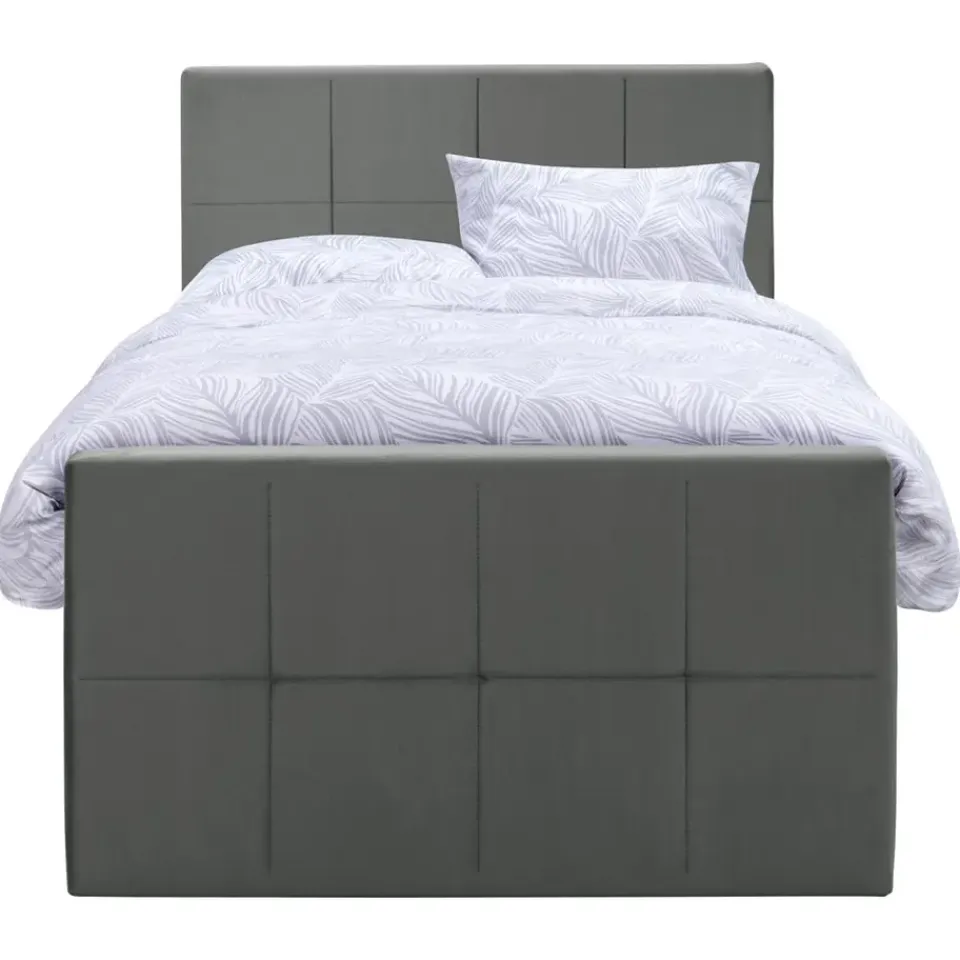 Boxspring Liv is een boxspring met een afmeting van 120×200 cm. Deze prachtige boxspring is bekleed met een velvet grijze stof en heeft een landelijke uitstraling met een geblokt hoofd- en voetbord. De Liv geblokt is uitgerust met een pocketveringmatras en daarnaast ook nog een koudschuim topdekmatras voor extra comfort. Het pocketveringmatras is omkeerbaar, bestaande uit zowel een medium- als een stevige kant. Hierdoor kun je zelf kiezen wat voor jou het meest comfortabel ligt.