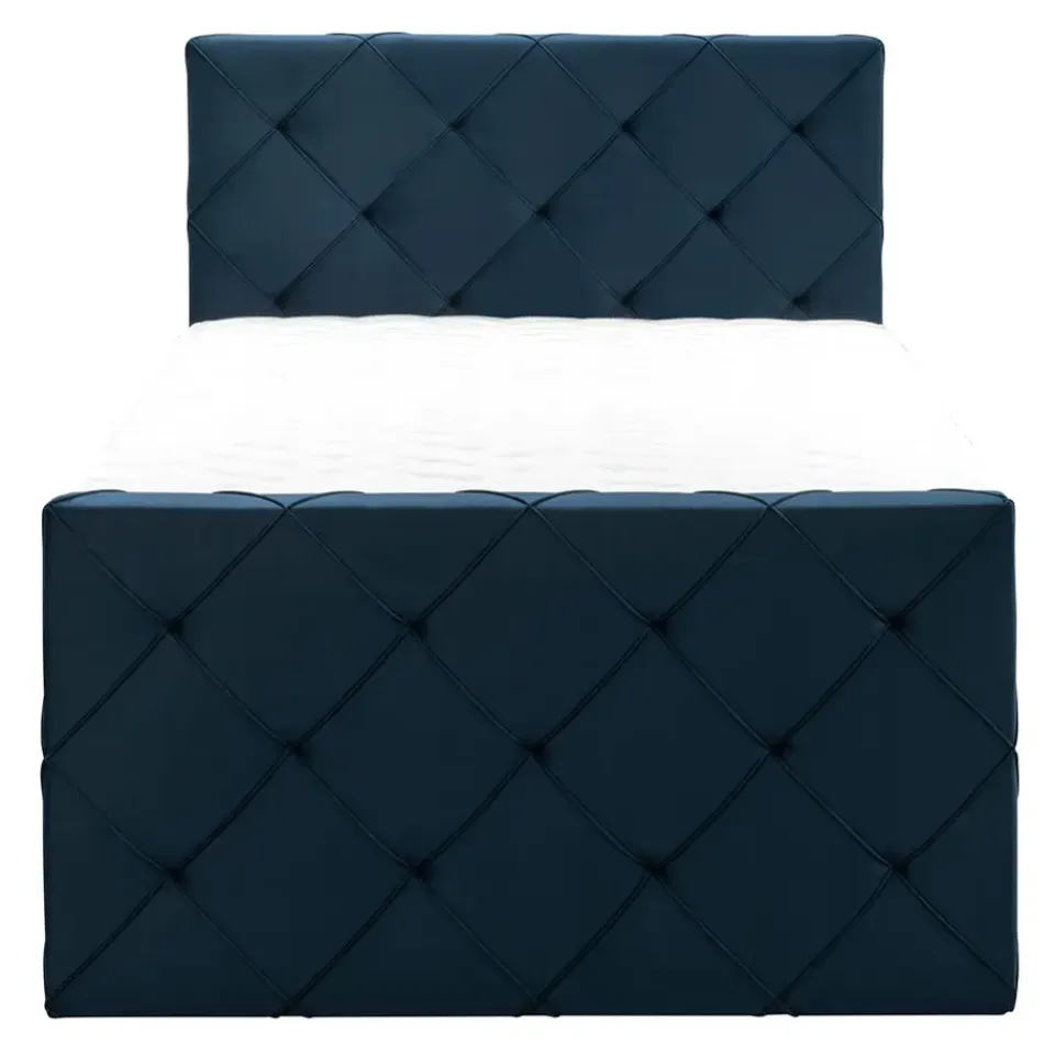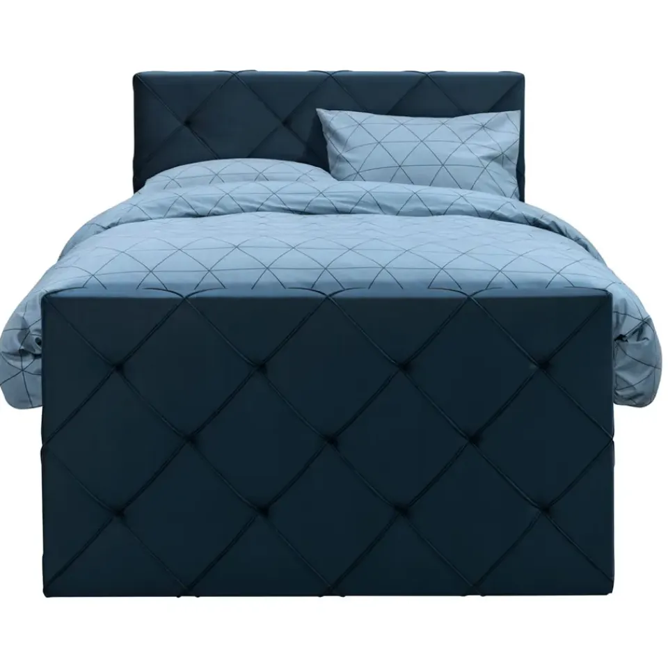 Boxspring Liv is een boxspring met een afmeting van 120×200 cm. Deze prachtige boxspring is bekleed met een velvet blauwe stof en heeft een romantische uitstraling met een geruit hoofd- en voetbord. De Liv geruit is uitgerust met een pocketveringmatras en daarnaast ook nog een koudschuim topdekmatras voor extra comfort. Het pocketveringmatras is omkeerbaar, bestaande uit zowel een medium- als een stevige kant. Hierdoor kun je zelf kiezen wat voor jou het meest comfortabel ligt.