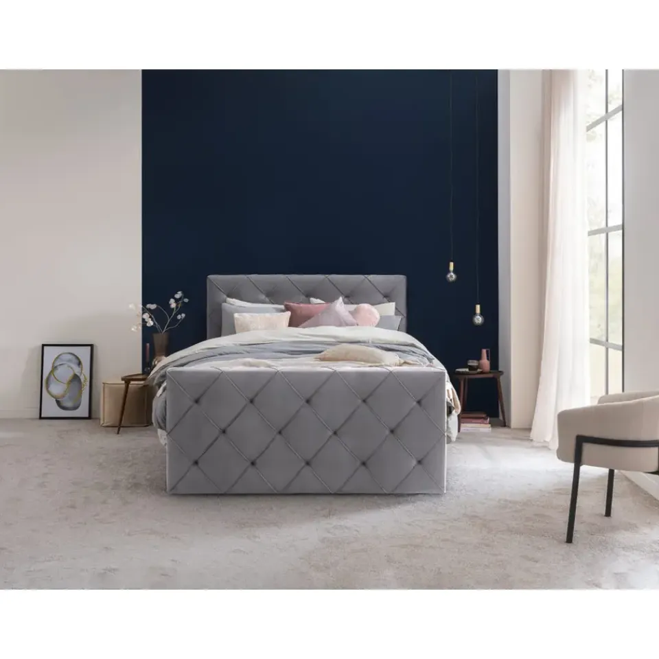 Boxspring Liv is een boxspring met een afmeting van 120×200 cm. Deze prachtige boxspring is bekleed met een velvet grijze stof en heeft een romantische uitstraling met een geruit hoofd- en voetbord. De Liv geruit is uitgerust met een pocketveringmatras en daarnaast ook nog een koudschuim topdekmatras voor extra comfort. Het pocketveringmatras is omkeerbaar, bestaande uit zowel een medium- als een stevige kant. Hierdoor kun je zelf kiezen wat voor jou het meest comfortabel ligt.