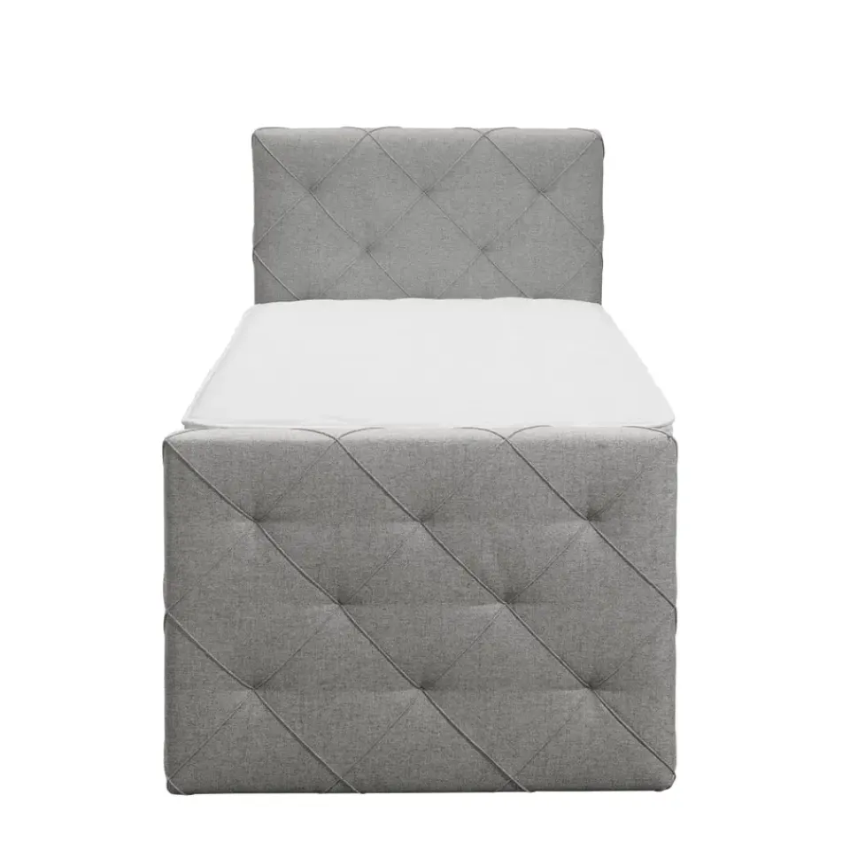 Boxspring Liv is een boxspring met een afmeting van 90×200 cm. Deze prachtige boxspring is bekleed met een fijn geweven lichtgrijze stof en heeft een romantische uitstraling met een geruit hoofd- en voetbord. De Liv geruit is uitgerust met een pocketveringmatras en daarnaast ook nog een koudschuim topdekmatras voor extra comfort. Het pocketveringmatras is omkeerbaar, bestaande uit zowel een medium- als een stevige kant. Hierdoor kun je zelf kiezen wat voor jou het meest comfortabel ligt.