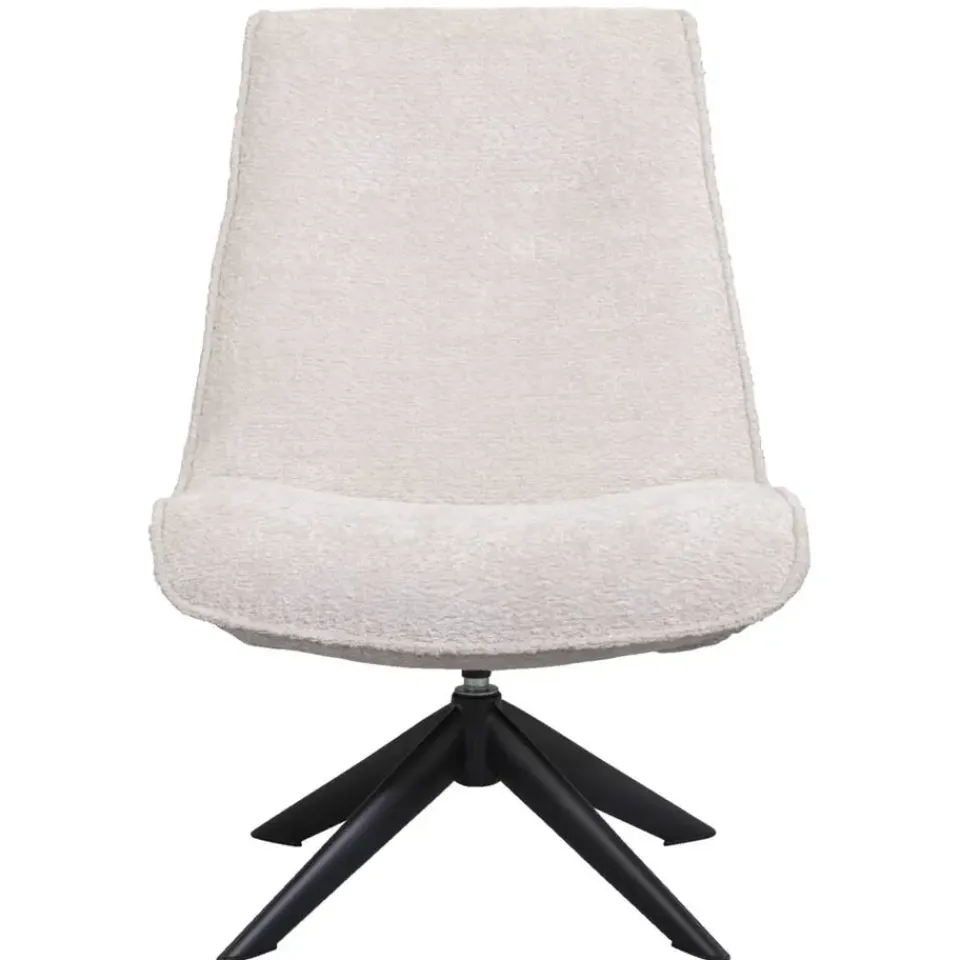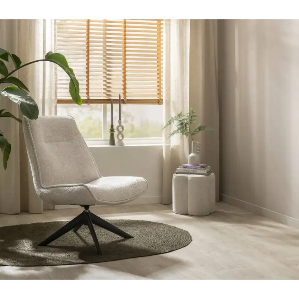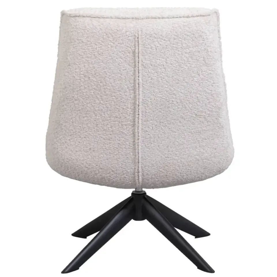 Kom volledig tot rust in Fauteuil Nora. Deze fauteuil is bekleed met een heerlijke bouclé stof en heeft 4 zwarte metalen poten waardoor hij een moderne en toch romantische uitstraling krijgt. De stoel is 360 graden draaibaar waardoor je zowel TV kunt kijken als je tot de visite kunt richten vanuit jouw ideale relaxstoel. Ook verkrijgbaar in taupe. Afmeting: 85x68x71 cm (hxlxb).