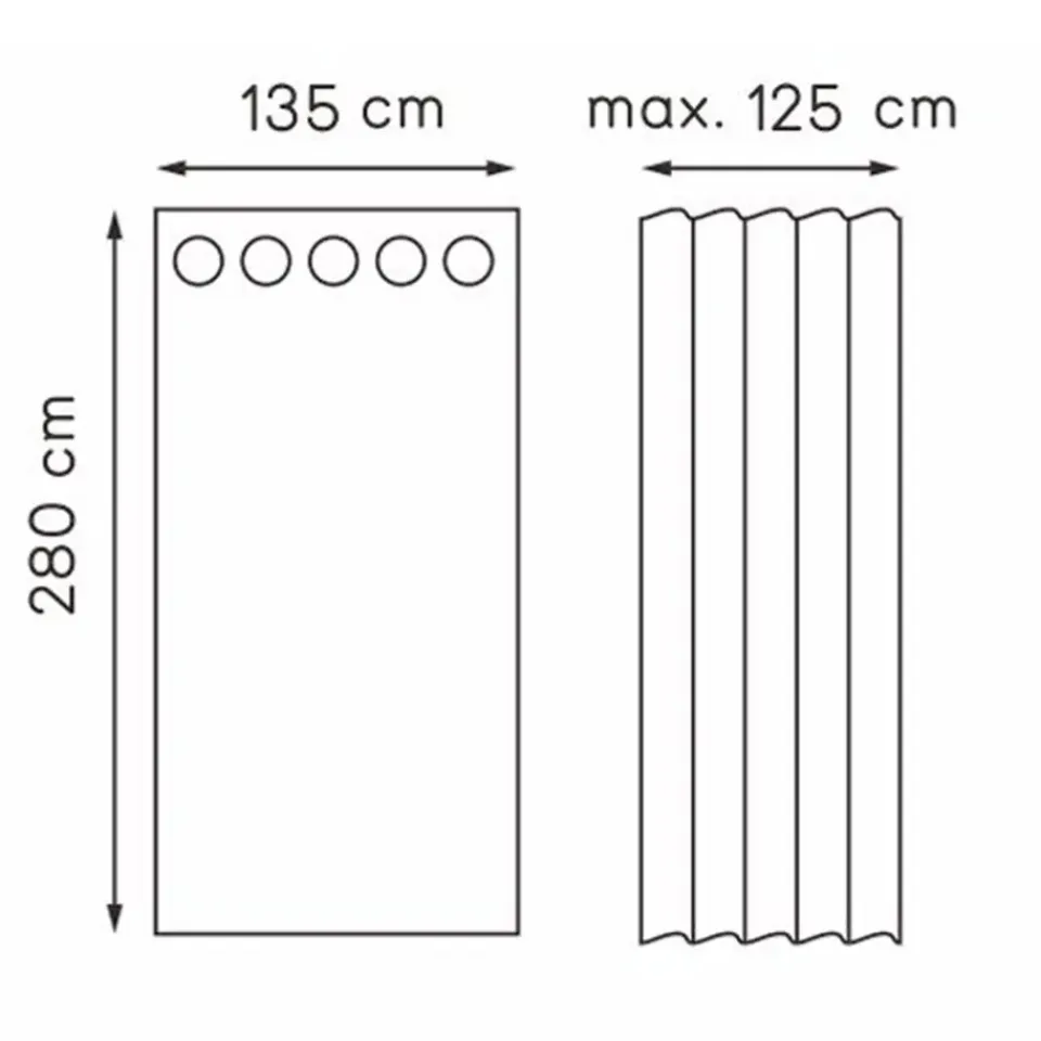 De gordijnstof is 135 cm breed. Als het aan de roede/rail hangt is het maximaal 125 cm breed.