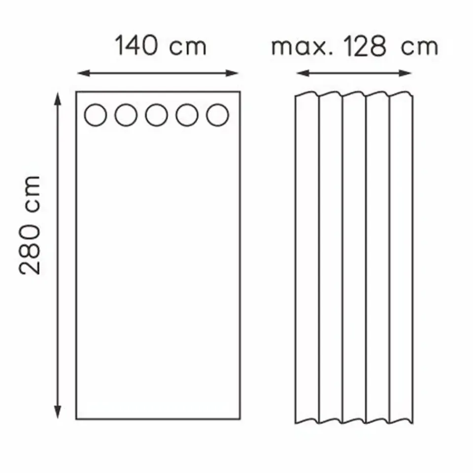 De gordijnstof is 140 cm breed. Als het aan de roede hangt is het maximaal 128 cm breed.