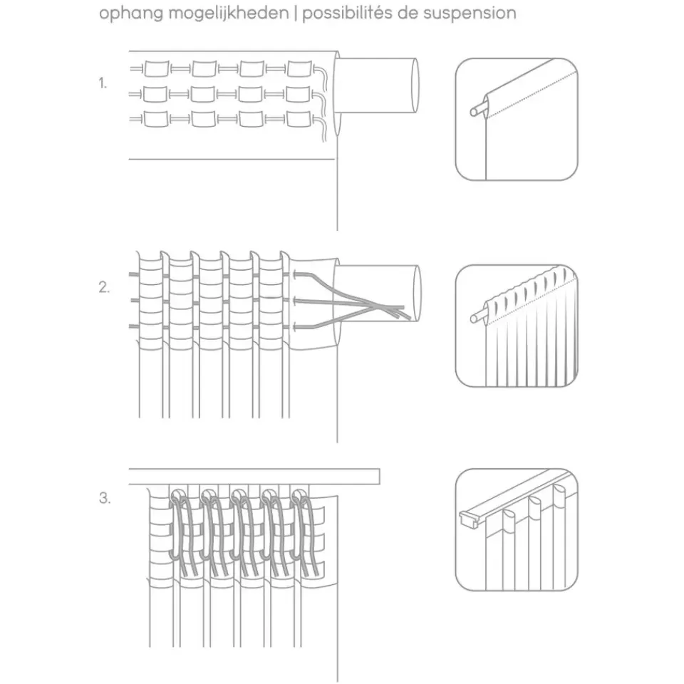 Het gordijn is voorzien van een plooiband met lussen. Deze kun je op 2 verschillende manieren ophangen. Je kan het gordijn aan een roede hangen met behulp van de lusjes of je kan aan een rail hangen met behulp van haken.