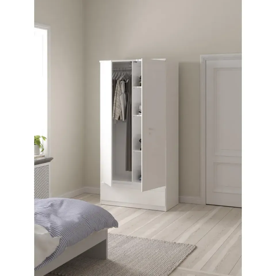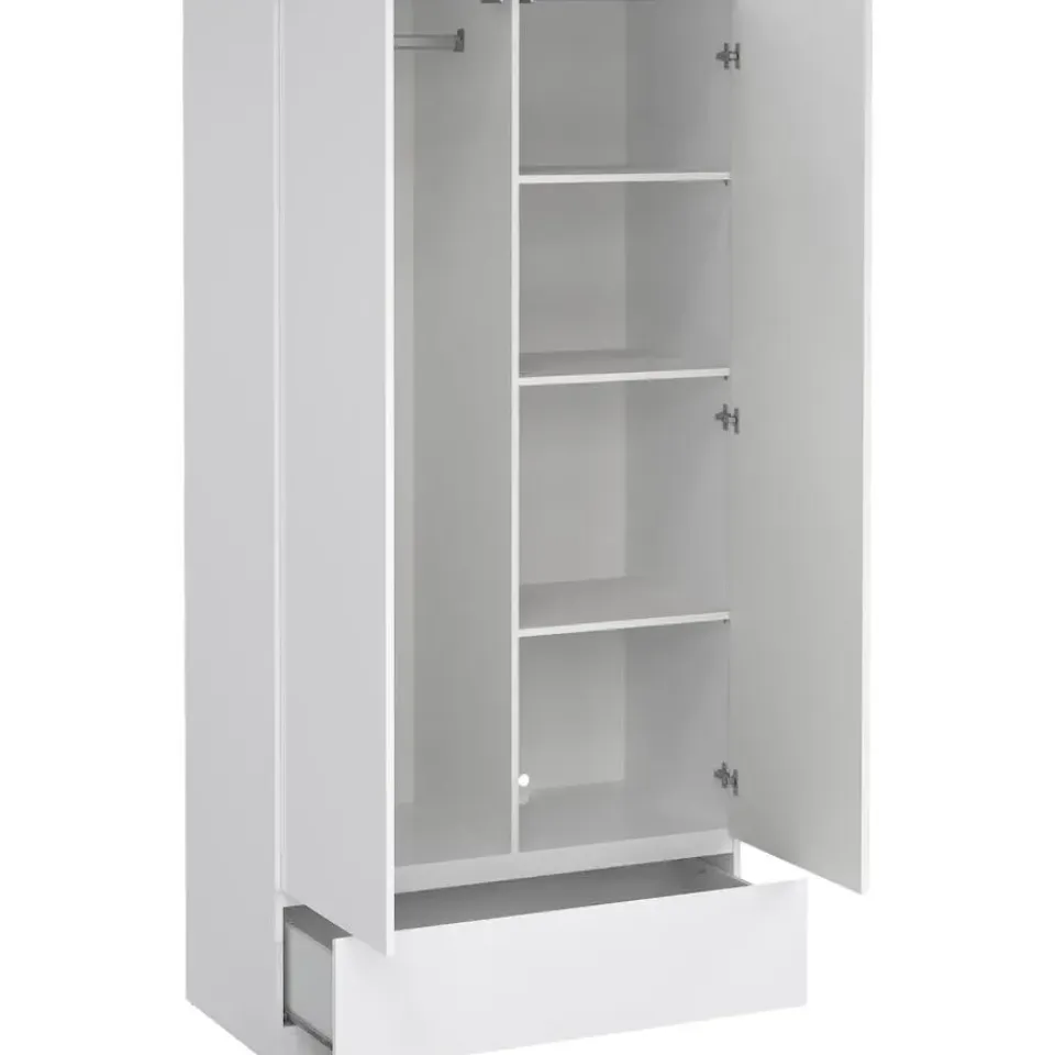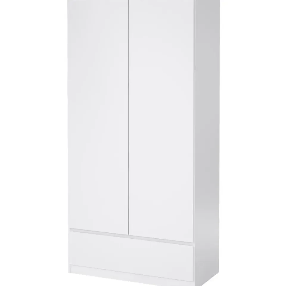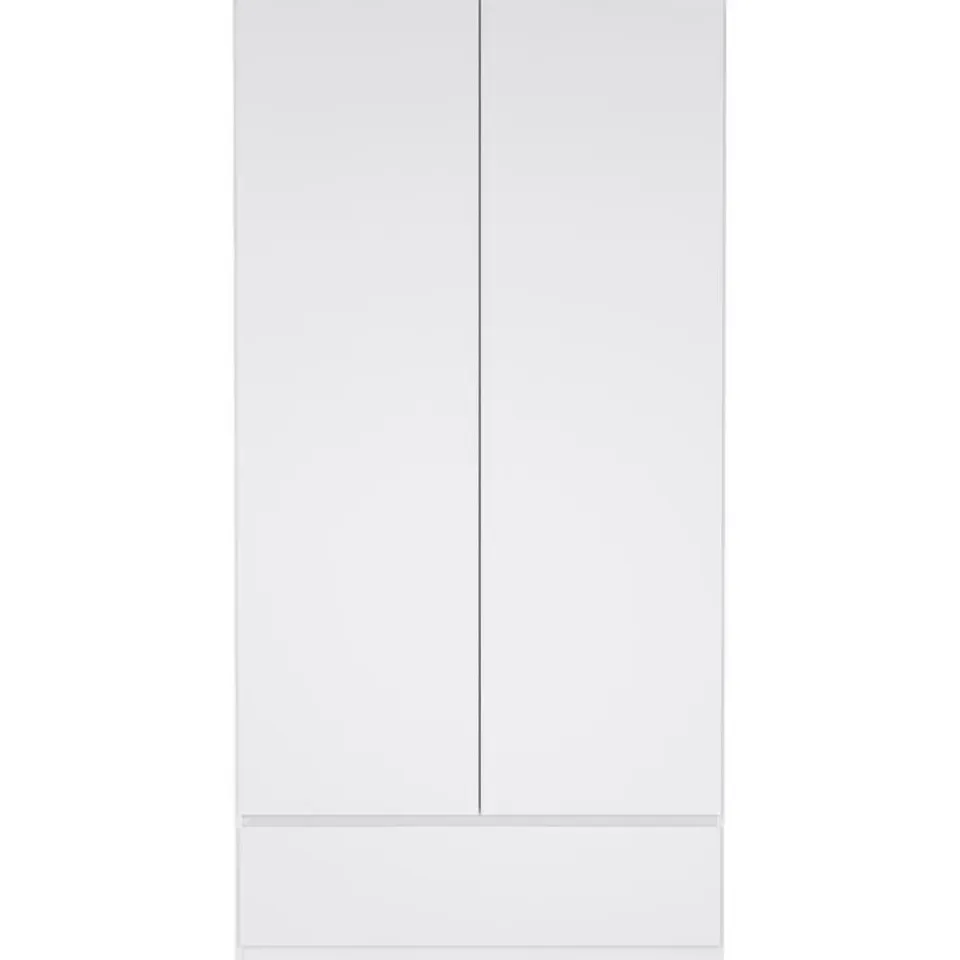 Kledingkast Naia is een 2-deurs kast met een greeploze afwerking in hoogglans wit. Het design van dit kastje bevat strakke vormen en rechte lijnen. Dit meubelstuk is gemaakt van spaanplaat.
