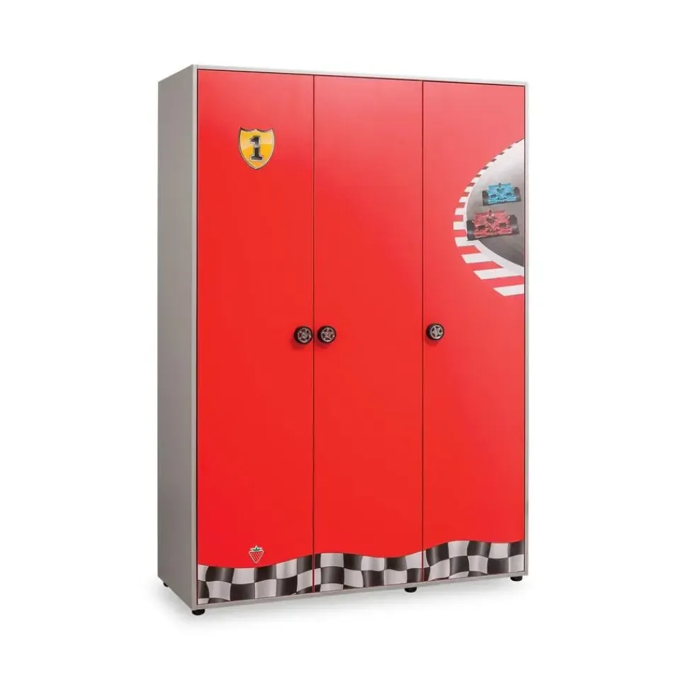 De Race Cup 3-deurs kledingkast is een prachtig afgewerkte kast met opvallende raceprints die perfect passen in een autokamer. Deze kast is onderdeel van de Race Cup thema kamer en is tot in detail ontworpen voor jonge raceliefhebbers. De deuren zijn voorzien van unieke handvatten in de vorm van racebanden. Binnenin vind je zowel een handig hanggedeelte als meerdere legplanken voor extra opbergruimte.