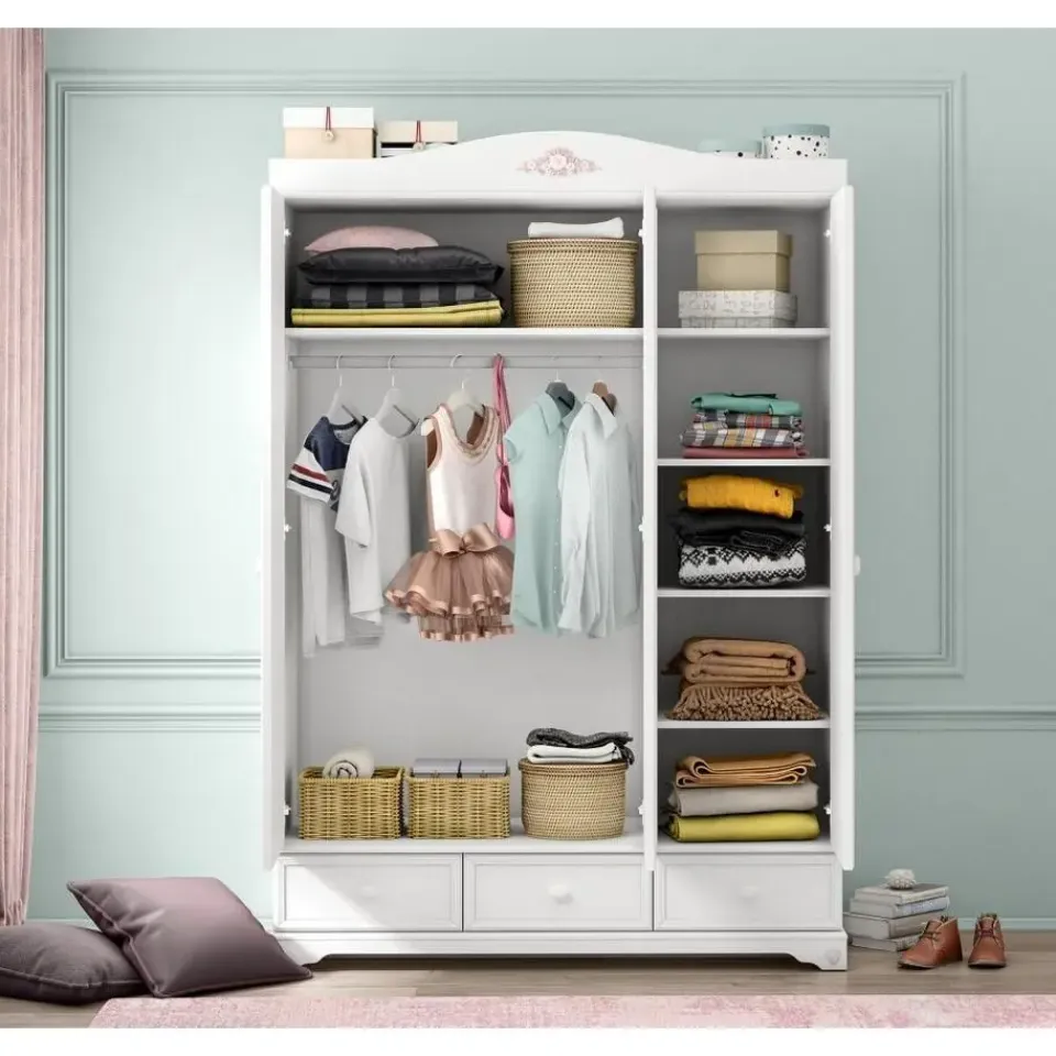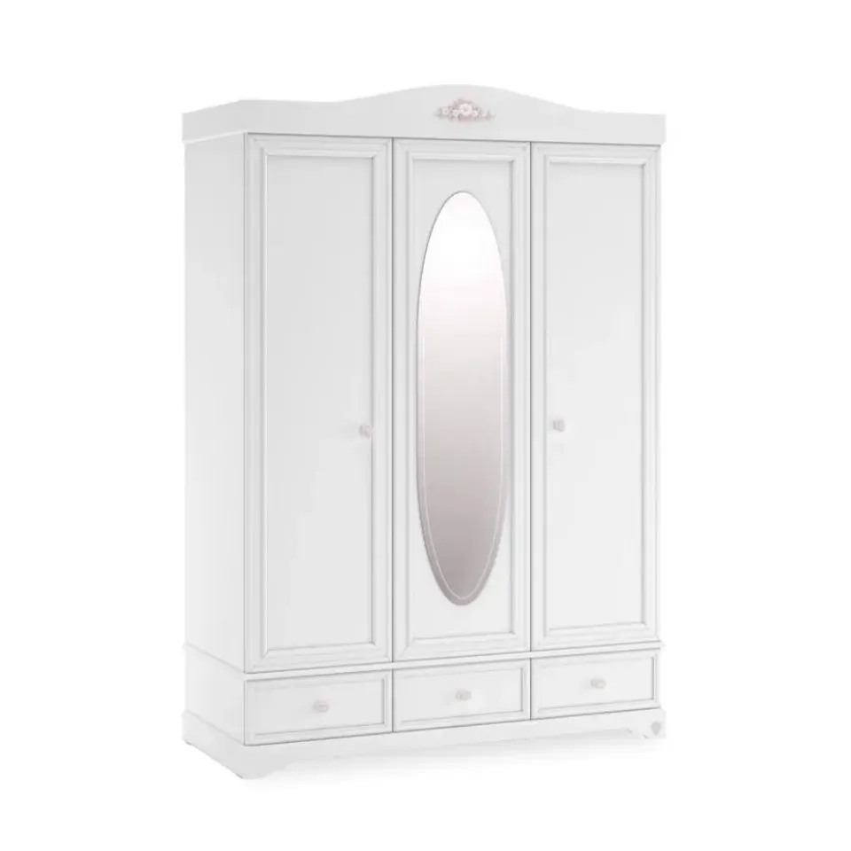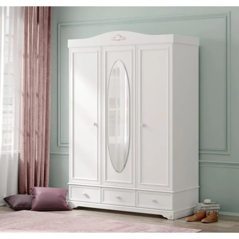 De Rustic 3-deurs kledingkast is een stijlvolle witte kledingkast voor de meisjeskamer. Deze kast beschikt over drie deuren, een elegante spiegel en drie ruime lades. Dankzij de combinatie van meerdere schappen en een hanggedeelte is deze kast niet alleen mooi om te zien maar ook zeer praktisch in gebruik. De sierlijke details geven de kast een romantisch en tijdloos karakter dat perfect past bij een meisjeskamer.