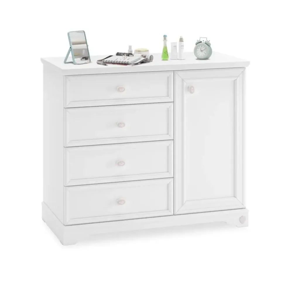 De Rustic commode ladekast is een stijlvolle en functionele toevoeging aan de meisjeskamer. Deze witte ladekast biedt met vier ruime lades en een extra kastje veel opbergruimte voor kleding, accessoires of speelgoed. Optioneel is een bovendeel met spiegel verkrijgbaar, waardoor de kast ook als kaptafel gebruikt kan worden. Het bovenstuk heeft bovendien een schap en twee extra lades, wat het meubel nog praktischer maakt.