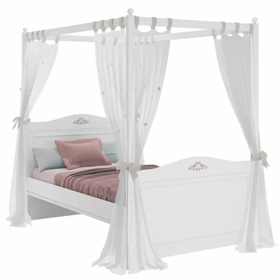 Het Rustic hemelbed is hét bed voor de meisjeskamer. Het witte meisjesbed prinsessenbed heeft sierlijke elementen zoals lichtroze bloemen op het hoofd- en voetenbord en luxe poten. De hemel is voorzien van een witte met roze vitrage met daarop bloementjes en vier sierlijke strikken. Optioneel kunt u er een bedlade bijbestellen. Deze kan dienen als logeerbed of als opberglade voor spullen.