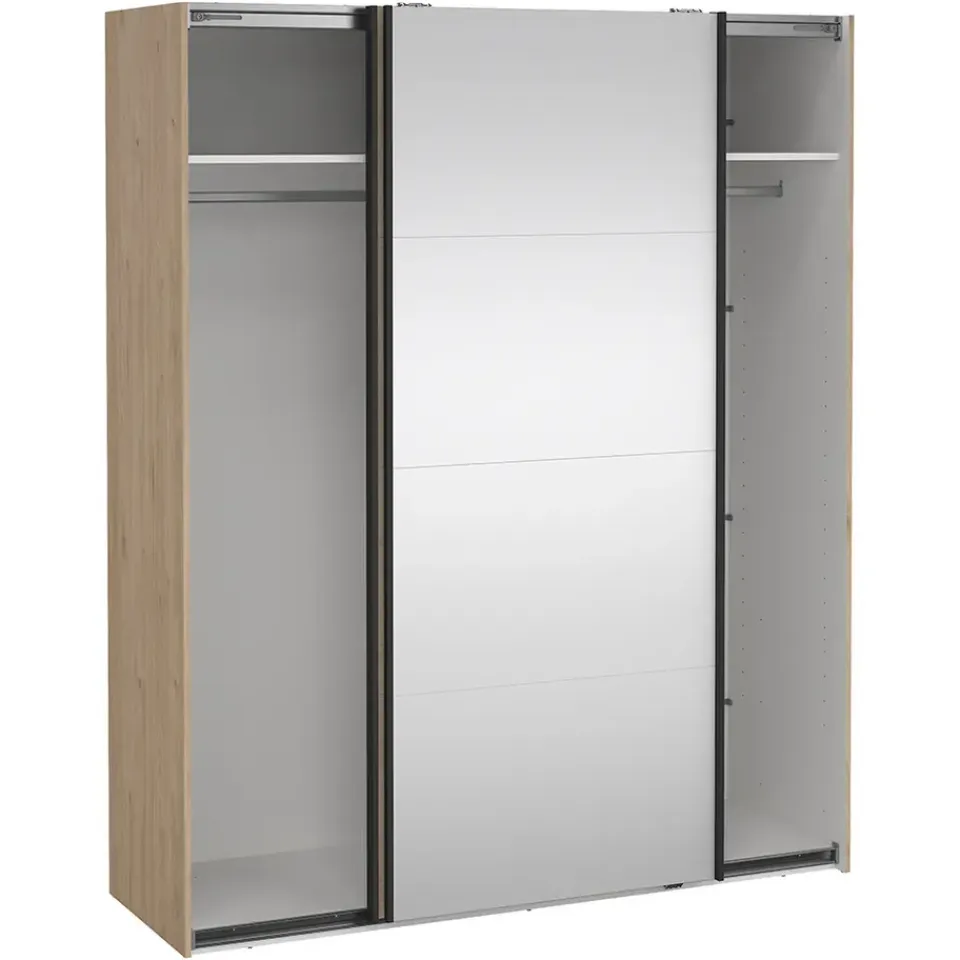 De kast beschikt over 2 legplanken en 2 roedes, wat zorgt voor een flexibele en efficiënte indeling. De legplanken bieden ruimte voor het opbergen van opgevouwen kleding, schoenen of accessoires, terwijl de roedes ideaal zijn voor het ophangen van je kleding, zoals jurken, overhemden of jassen. Hoewel de kast geen lades heeft, zorgt de slimme opbergruimte met planken en roedes ervoor dat alles netjes geordend blijft. De schuifdeuren maken de kast ideaal voor slaapkamers met beperkte ruimte, aangezien je geen extra ruimte hoeft vrij te maken voor draaideuren.