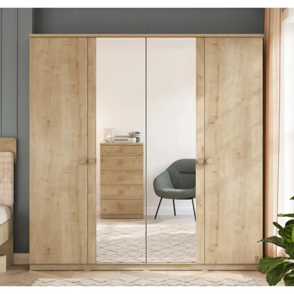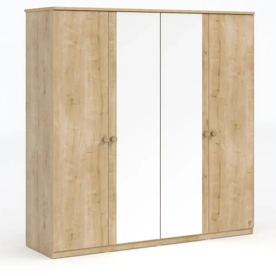 Deze kledingkast uit de Stockholm tienerkamer is een ruime en elegante opbergoplossing voor de kinderkamer. Met vier deuren, twee grote spiegels en een hoogwaardige houtlook afwerking past de kast perfect in elke slaapkamer. Dankzij het soft close systeem sluiten de deuren geruisloos en veilig. De kast biedt volop opbergmogelijkheden met zowel een hang- als een leggedeelte.