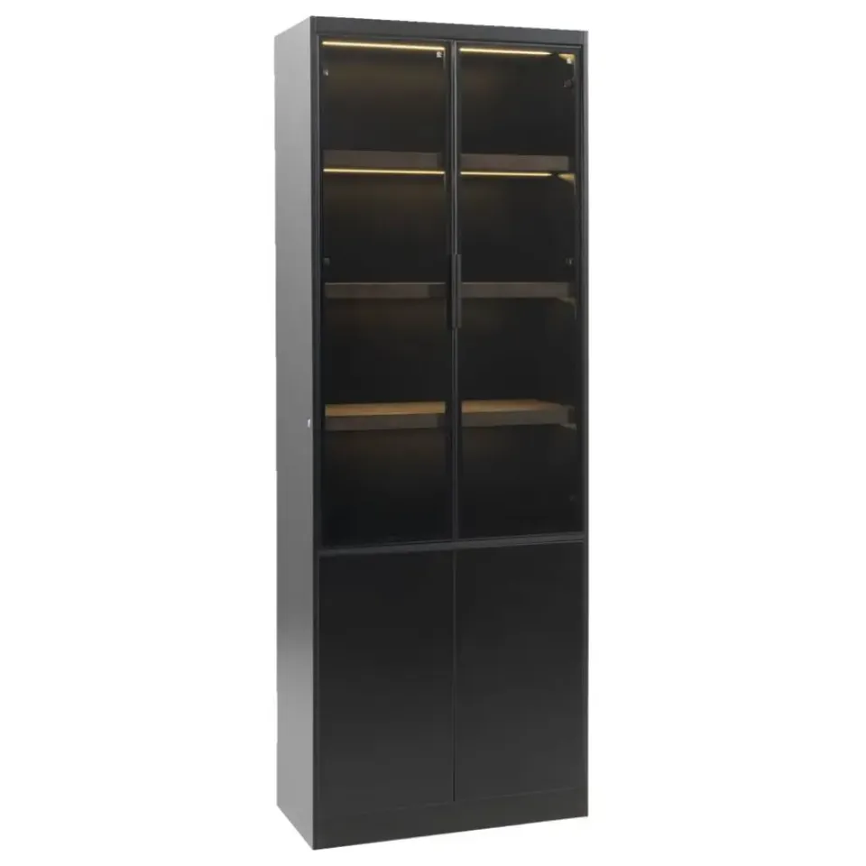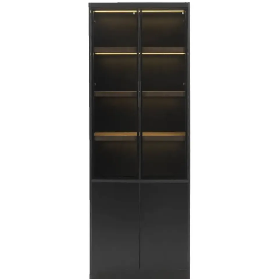 Vitrinekast Virgil is er in verschillende maten en kleuren. Deze variant is 220x80x40 cm (hxbxd) en is zwart. De kast is gemaakt van MDF en heeft 2 softclose deuren. Dat betekent dat de deur zacht dicht valt. Door de combinatie van kleur en materiaal past deze wandkast goed in een modern en stoer interieur.