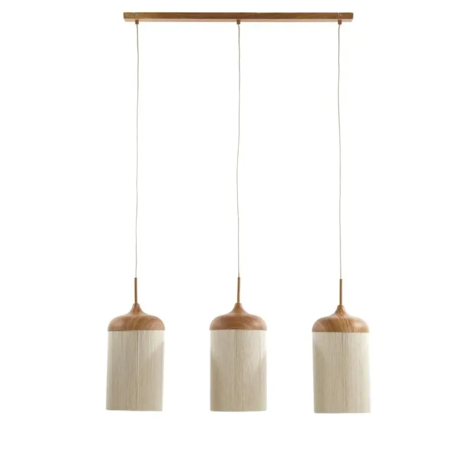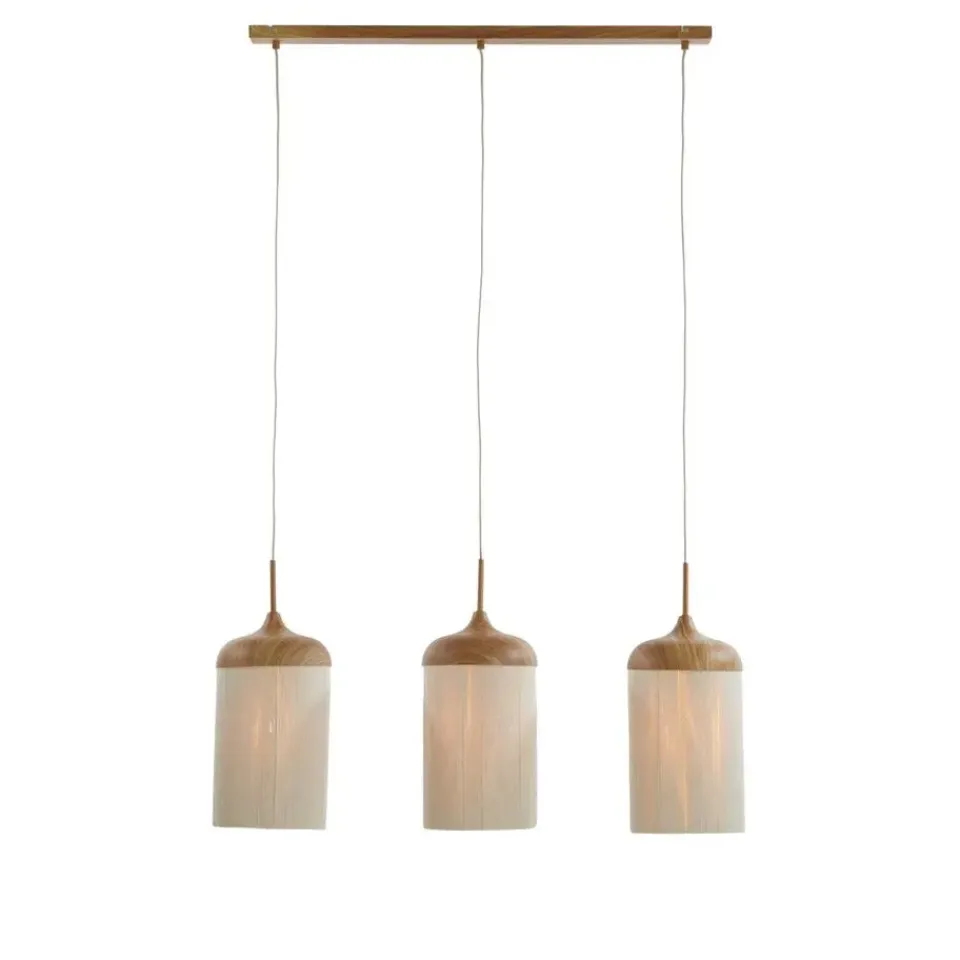Deze hanglamp Dania van Light & Living brengt warmte en sfeer in de woonkamer of eetkamer. De plafond lamp is voorzien van 3 lichtpunten met een beige lampenkap die zacht, diffuus licht verspreiden. De lampenkapjes zijn gemaakt van gespannen katoenen draden. De bevstigingsbalk voor het plafond en de bovenkant van de lampenkapjes zijn gemaakt van ijzer, afgewerkt met een verfijnde houtprint. Dit combineert de stevigheid van metaal met de natuurlijke uitstraling van hout. Deze plafondlamp is niet alleen een praktische verlichtingsoplossing, maar ook een stijlvolle toevoeging aan je interieur.