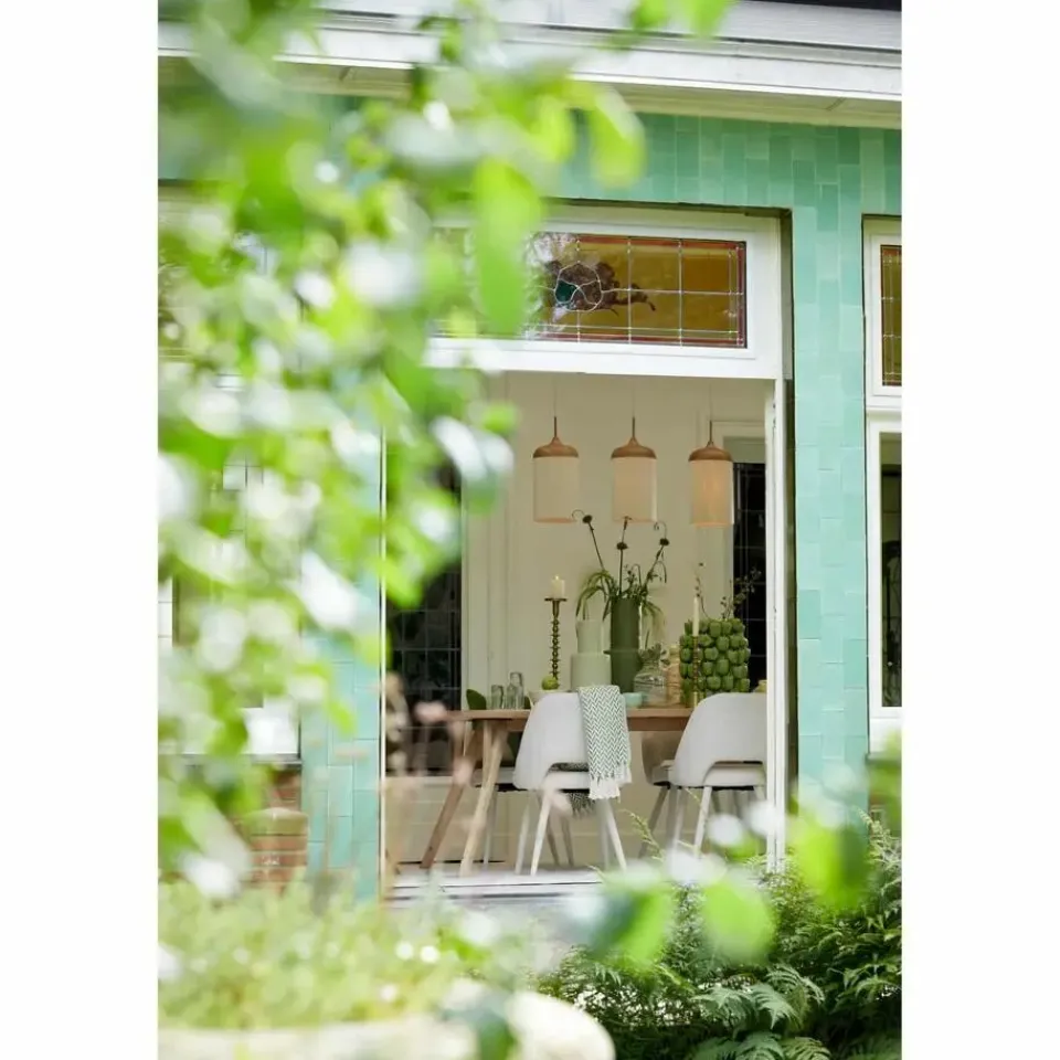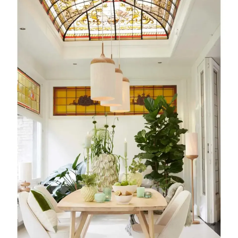 - Beige lampenkapjes, gemaakt van katoenen draden, voor diffuus sfeervol licht.