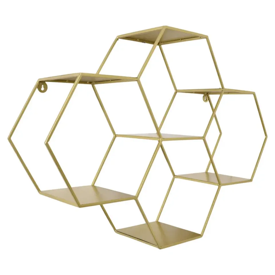 Geef jouw interieur een stijlvolle update met dit moderne hexagon wandrek in goud. Het unieke honingraat-design combineert strak met elegant, waardoor dit wandrek perfect past in een Scandinavisch, Japandi en industrieel interieur. Dankzij de vier open vakken creëer je eenvoudig een speels geheel waar je jouw favoriete accessoires, planten of geurkaarsen in kunt presenteren.