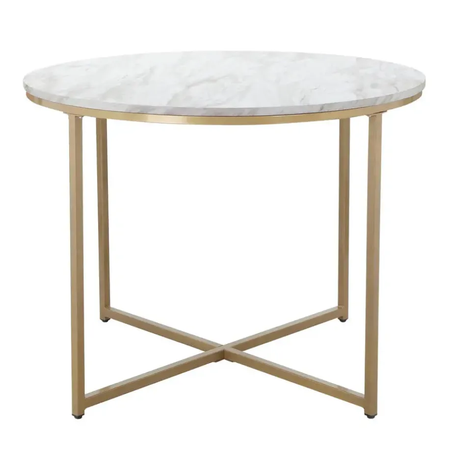 Een vleugje luxe voor je huis: dat is wat de ronde eettafel met zijn extravagante design je biedt. Dankzij de geraffineerde combinatie van materialen en decor zal deze tafel een echte blikvanger zijn in je eetkamer. Een rond marmeren blad rust op een verguld metalen frame met vier poten. Je kunt je naasten rond deze tafel verzamelen om samen te dineren en quality time met elkaar door te brengen. De oppervlakken zijn gemakkelijk schoon te maken en gemaakt van FSC®-gecertificeerd hout. Verkrijgbaar in twee maten.