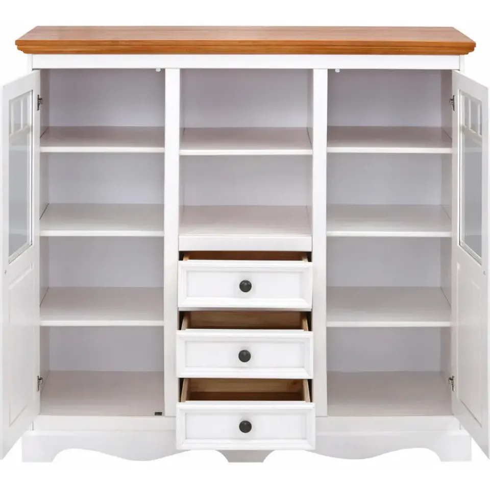 Gemaakt van FSC®-gecertificeerd massief hout, benadrukt het houtuiterlijk de landelijke stijl van de kast. De gebogen elementen en mooie sierlijsten, gecombineerd met metalen handgrepen, zorgen voor een harmonieuze uitstraling. Vazen en verzamelobjecten kunnen worden tentoongesteld achter de glazen inzetstukken van de deuren. Het onderste gedeelte is ideaal voor het opbergen van keukengerei of huishoudtextiel. Bestek en andere kleine voorwerpen vinden hun plaats in de lades. In de open compartimenten komen boeken of fotolijsten van uw dierbaren goed tot hun recht.