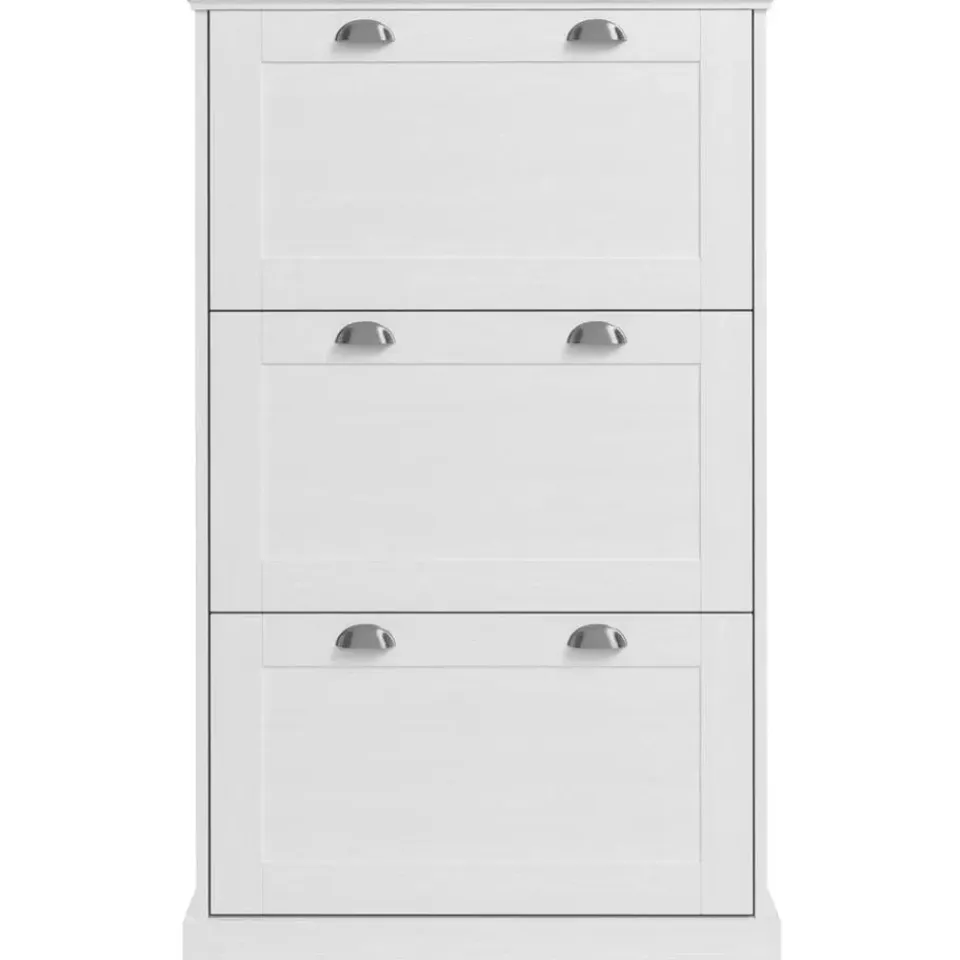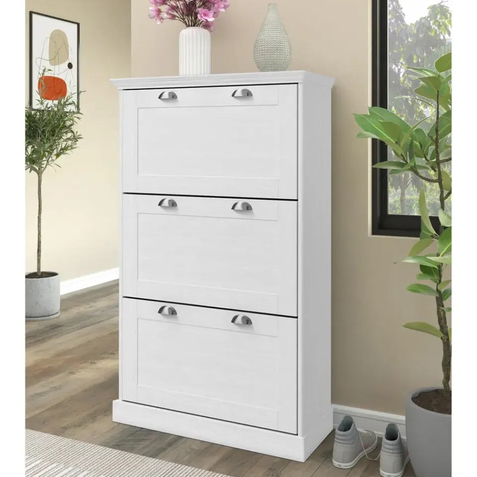 Deze elegante schoenenkast heeft drie kleppen, wat veel opbergruimte biedt voor je schoenen. De witte afwerking voegt een vleugje elegantie toe aan elke gang of entree.