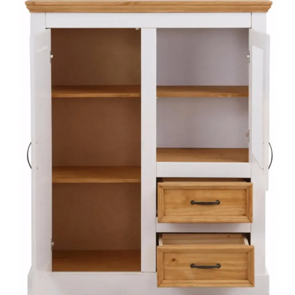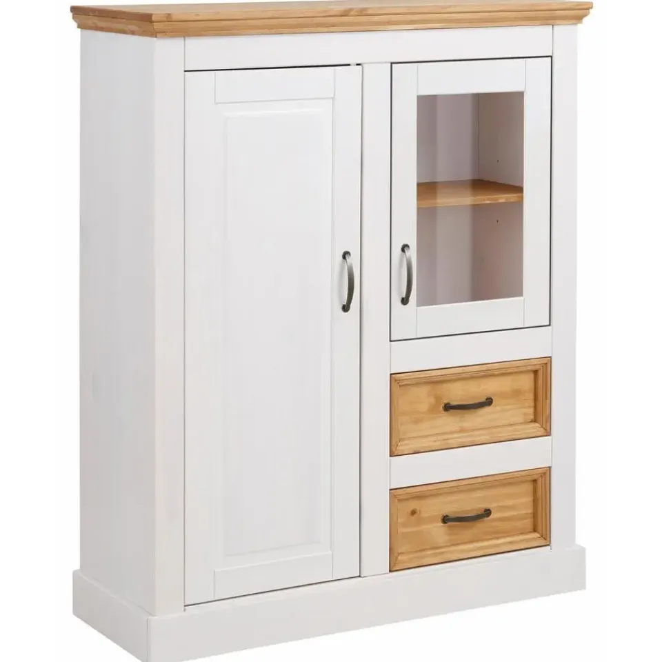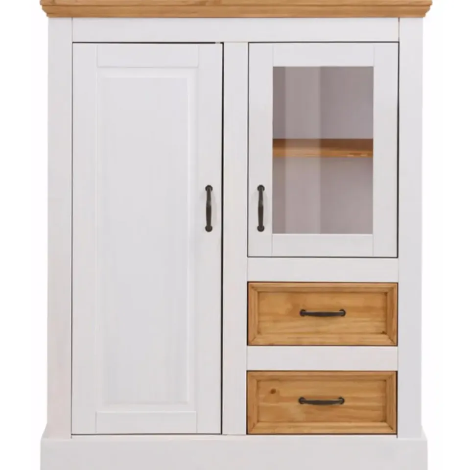 Dit FSC-gecertificeerde wandmeubel is een veelzijdig meubel in de klassieke landhuisstijl. Het is een elegante toevoeging aan de woonkamer of eetkamer en biedt veel extra opbergruimte. Achter verschillende lades en deuren is er ruimte voor een grote verscheidenheid aan keukengerei en voorwerpen. De zichtbare opbergruimte biedt veel ruimte voor decoratie. De kast dankt zijn charme aan de combinatie van gecoate oppervlakken en natuurlijk ogende houten elementen, met hun duidelijk zichtbare, voelbare houten structuur. De antieke metalen handgrepen maken de look compleet.