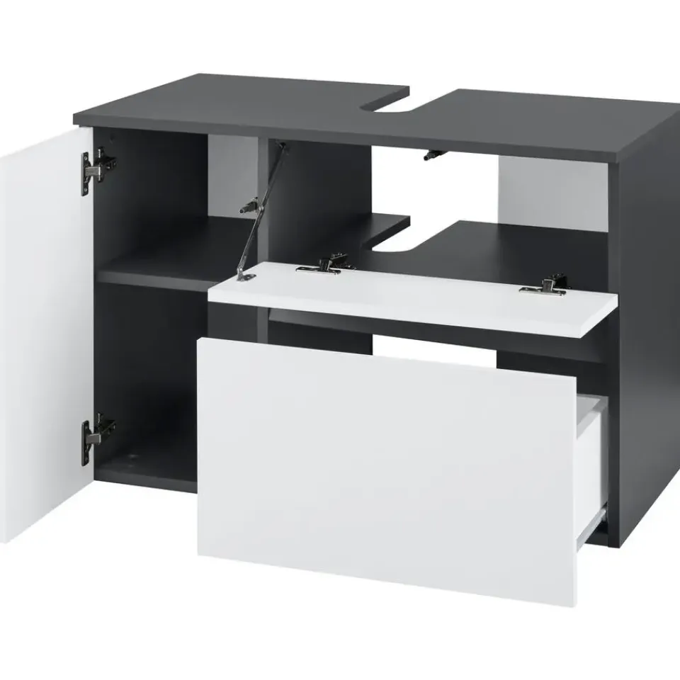 Het badmeubel met matte fronten geeft je badkamer een modern tintje. Achter de deur en klep met push-open functie zit handige opbergruimte voor verschillende gebruiksvoorwerpen. Het badmeubel heeft ook een ruime lade.