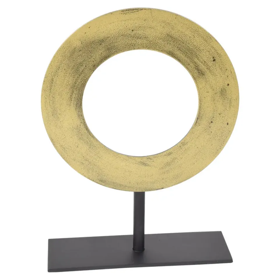 Breng warmte en elegantie in je interieur met deze messingkleurige metalen cirkel op voet. De goudtint geeft een luxe uitstraling zonder overheersend te zijn, waardoor dit decoratieve object perfect past binnen een Japandi, Scandinavisch of modern interieur.