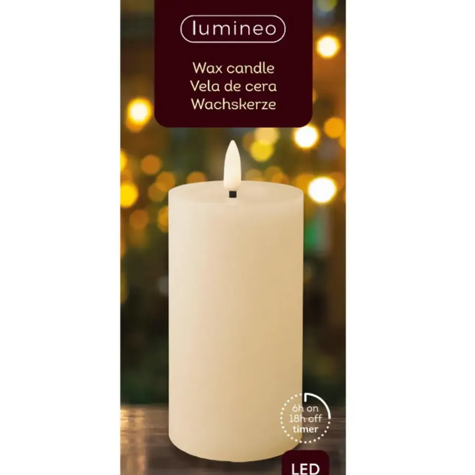 LED kaars/stompkaars in de kleur creme wit met een steady vlam. De Lumineo LED kaars/stompkaars is een elegante en stijlvolle kaars met warm witte LED vlam. Deze kaars heeft een afmeting van D7 x H15 cm en is geschikt voor binnen gebruik. De kaars is voorzien van een 6/18 uurs timer, waarmee je de verlichting kunt instellen op een tijd die je wilt. De LED verlichting is energiezuinig en geeft een warm, gezellig licht. Geschikt voor binnen.