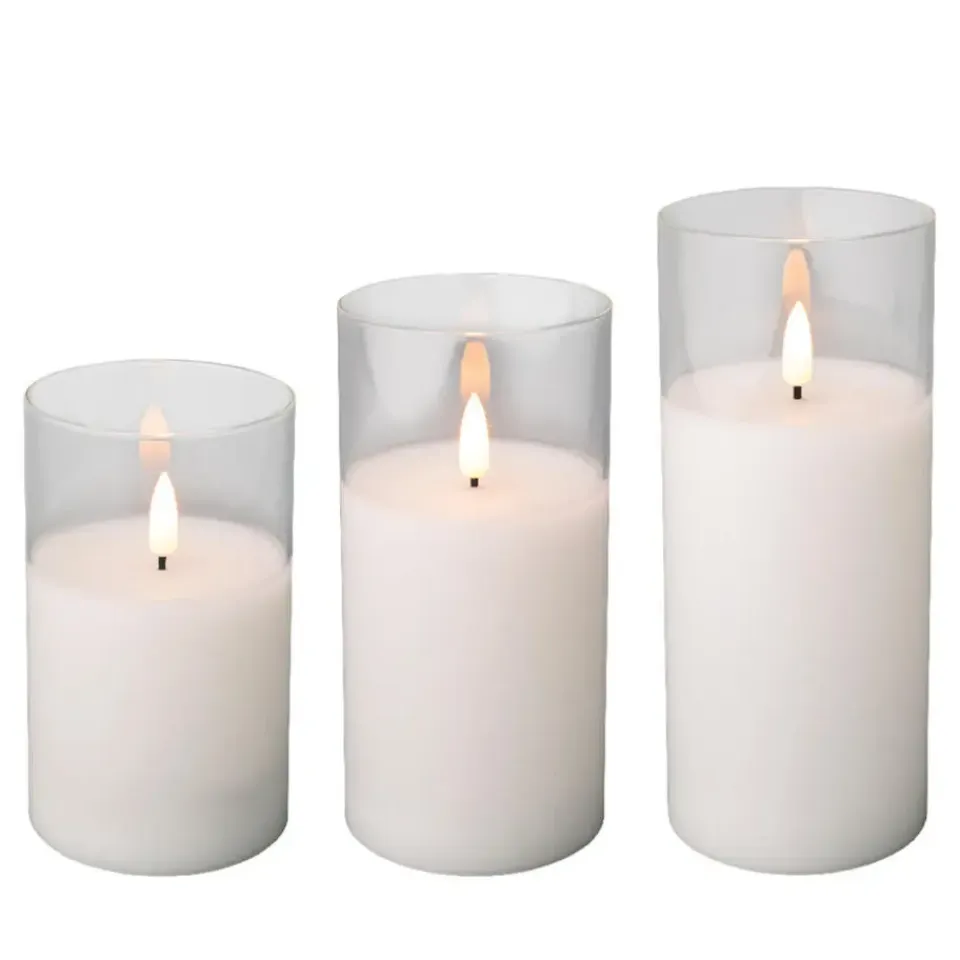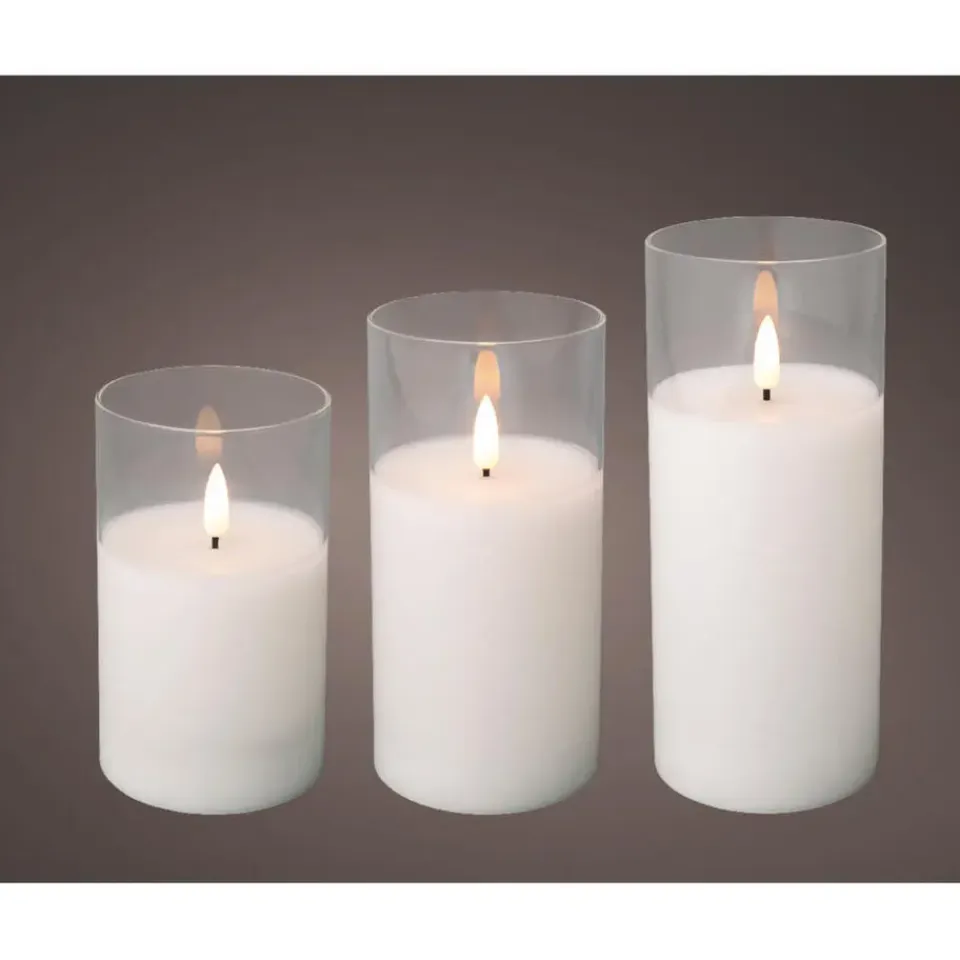 Set van 3 luxe witte Lumineo LED stompkaarsen in glas met timerfunctie*Deze elegante LED kaarsen in glas creeren een warme en rustgevende sfeer in huis. De kaarsen zijn wit van kleur, met een diameter van 7,5 cm en een hoogte tot 17,5 cm voor de grootste kaars. Ze zijn voorzien van een handige 8/16-uur timer, waardoor ze automatisch uitschakelen na een vooraf ingestelde tijd. Met een brandduur van 250 uur per kaars en een IP20-classificatie zijn ze perfect voor veilig gebruik binnenshuis. Werkt op 2 AA batterijen per kaars (niet inbegrepen). Warm wit licht voor een gezellige ambiance.