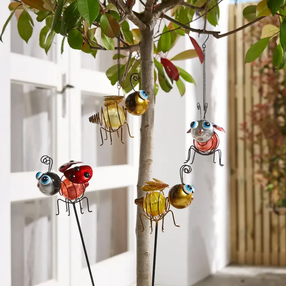 De Bee and LadyBug Hang van Luxform is de gemakkelijkste manier om verlichting in je tuin te plaatsen. Daarnaast geeft de Bij en Lieveheersbeestje door de verschillende verkrijgbare kleuren een vrolijke noot in de tuin! Houd er rekening mee dat het zonnepaneel in kogel naar boven wijst, zodat het solarpaneel voldoende zonlicht op kan vangen. Zodra het ’s avonds donker wordt, licht de kunststof glazen bol van de kleurrijke Bij en Lieveheersbeestje automatisch op. Deze metalen Bij en Lieveheersbeestjes zijn uitgerust met 4 witte LED’s op één streng. De lange veer en de haak maken het heel eenvoudig om de Bij en Lieveheersbeestje hangend in de tuin te plaatsen, bijvoorbeeld boven een tafel, een hek, pergola of aan een rozenboog. De Bij en Lieveheersbeestje kan daarnaast ook op zijn pootjes staan.