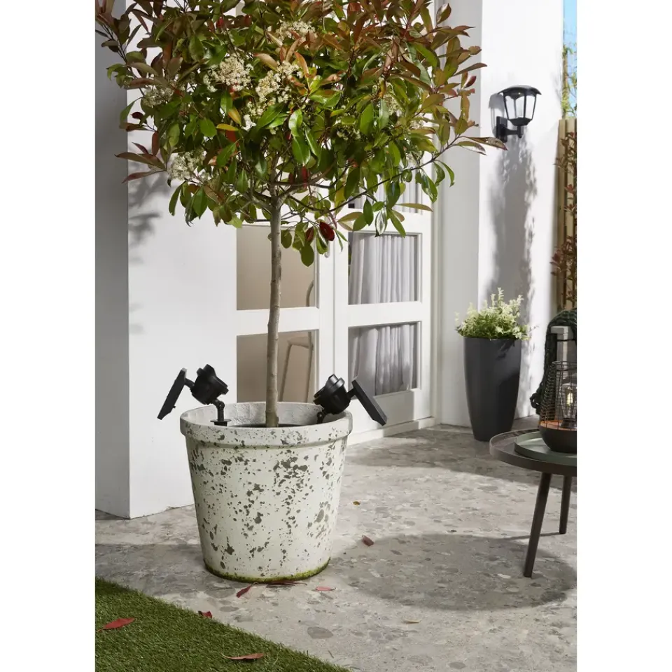 Luxform introduceert de nieuwe Solar Intelligente Hybride spotlamp Texas in het assortiment. Deze aluminium spot is voorzien van een warm witte LED die een maximale lichtopbrengst van 100 lumen heeft. De bijgeleverde grondspies zorgt ervoor dat de Texas zeer simpel in een zachte ondergrond gestoken kan worden. Zowel het zonne-paneel als de kop van de spot kunnen versteld worden, zodat er optimaal dag- en zonlicht opgevangen kan worden. Daarbij kan de lichtstraal perfect op het uit te lichten object, boom of struik gericht worden.