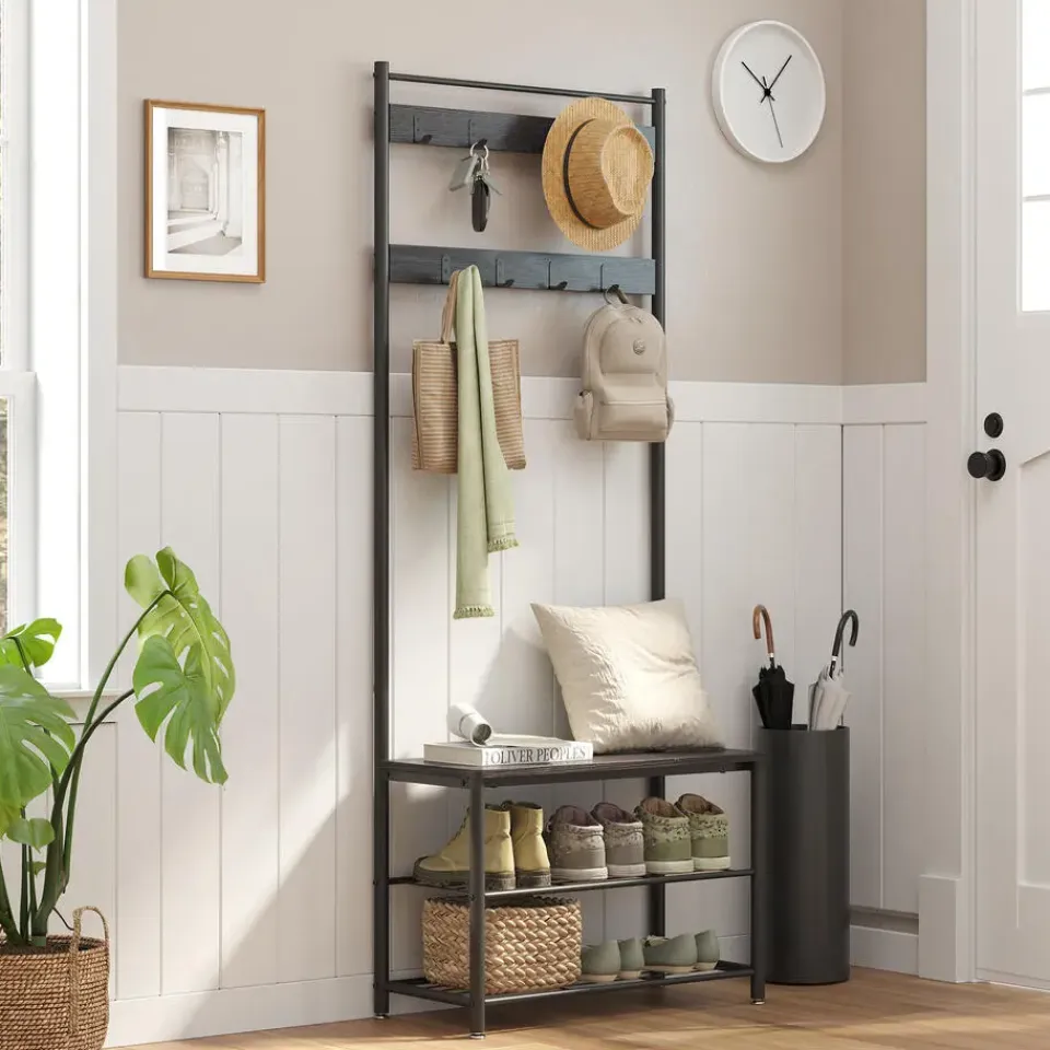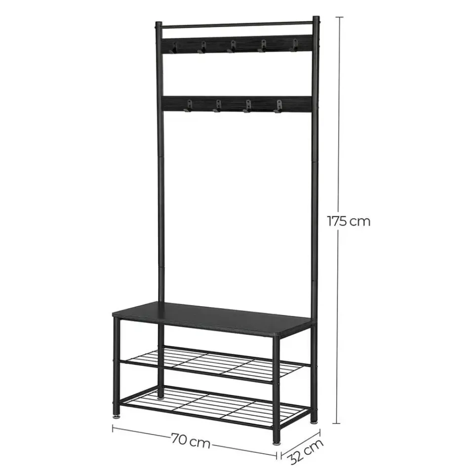 Naast de functie van kapstok beschikt dit kledingrek ook over een verzamelruimte voor schoenen. Twee metalen schappen voorzien u ruimte voor zo’n acht paar schoenen. Het gehele schoenenrek draagt tot 80 kg terwijl de haken elk 3 kg draagcapaciteit beschikken. Het spreekt voor zich dat dit type rek uitermate interessant is voor zij die houden van efficiëntie. Jassen en schoenen worden voortaan immers op één en dezelfde plaats verzameld.