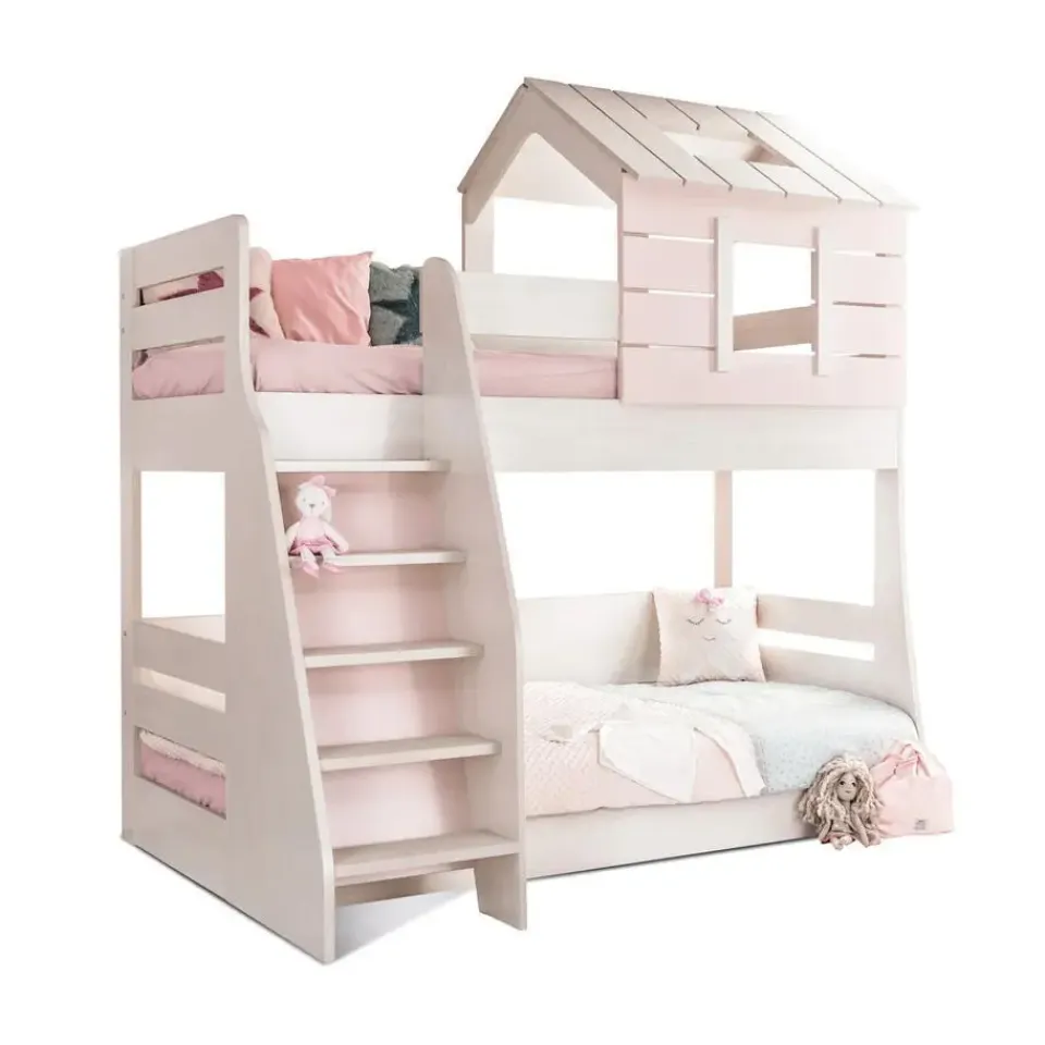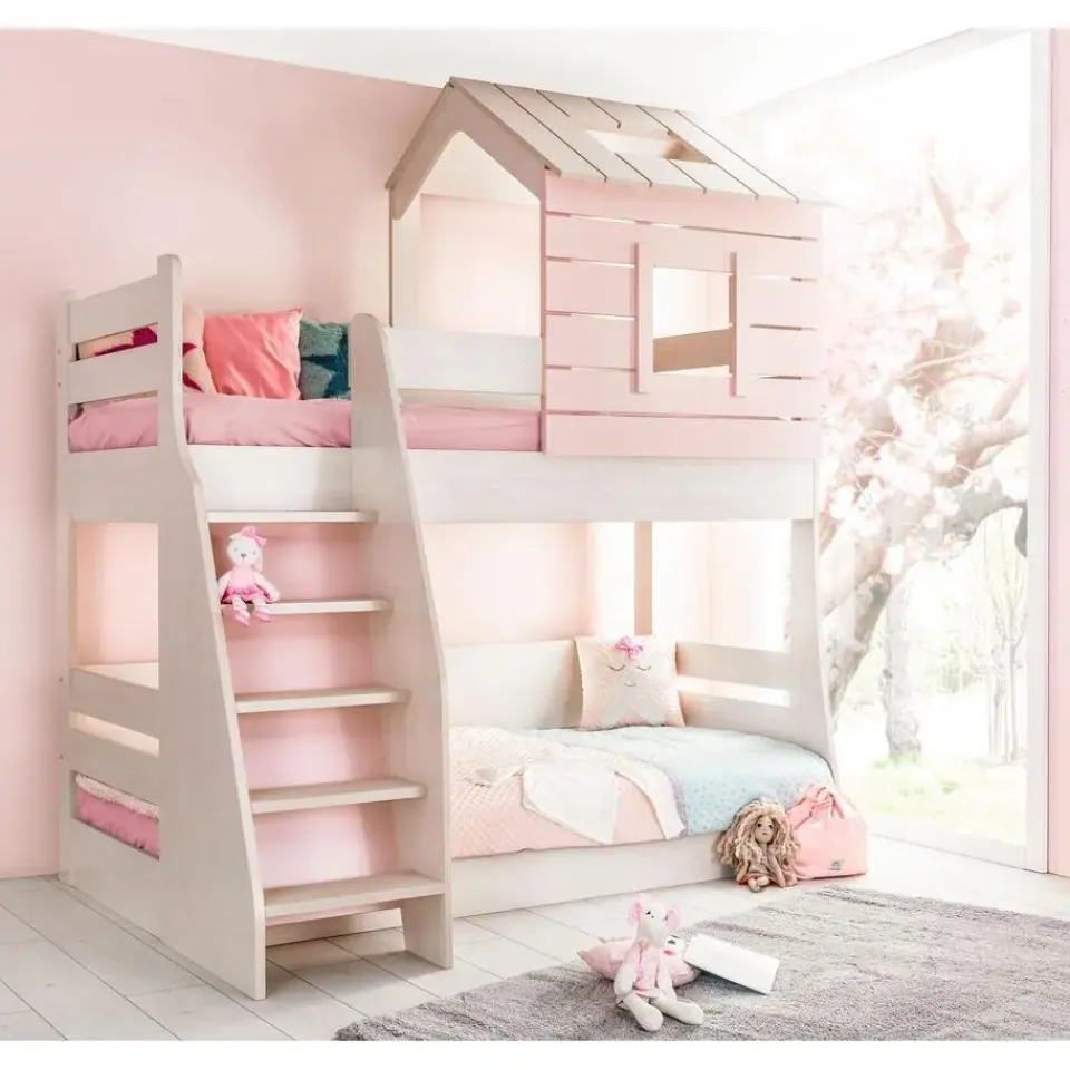 Het witte met lichtroze Cento Pink stapelbed is een prachtig bedhuisje speciaal ontworpen voor de meisjeskamer. Dankzij het unieke design en de stevige valbeveiligingen is dit bed niet alleen veilig maar ook stijlvol. Het bovenste bed heeft een afmeting van 200 x 90 cm en het onderste bed meet 200 x 100 cm, waardoor beide kinderen ruim en comfortabel slapen. Met het dakje boven het bovenbed krijgt dit stapelbed een gezellige en speelse uitstraling die perfect past binnen de Cento Pink meisjeskamer.