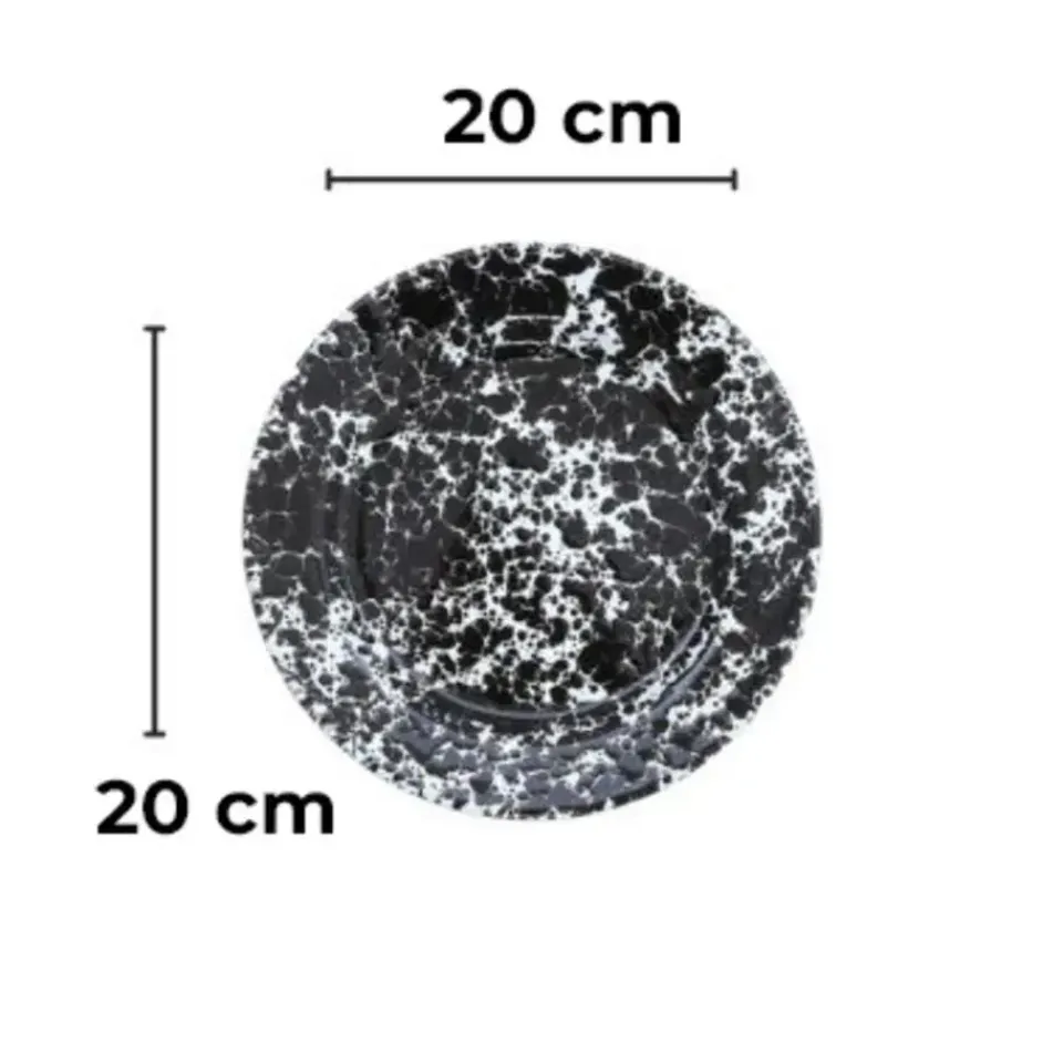 Elk bord is vakkundig vervaardigd met een robuuste emailleconstructie die bestand is tegen spaanders en krassen. Het kenmerkende splatterpatroon voegt een speelse en rustieke esthetiek toe aan uw eettafel, waardoor elke maaltijd een stuk aantrekkelijker wordt.