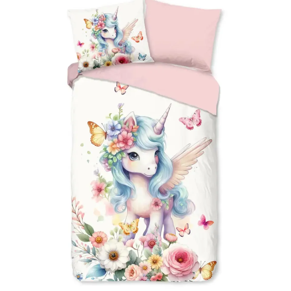 Cre’er een magisch slaapmoment met het Kinderdekbedovertrek ZouZou Gaby ‘ waar dromen beginnen tussen bloemen, vlinders en eenhoornmagie.