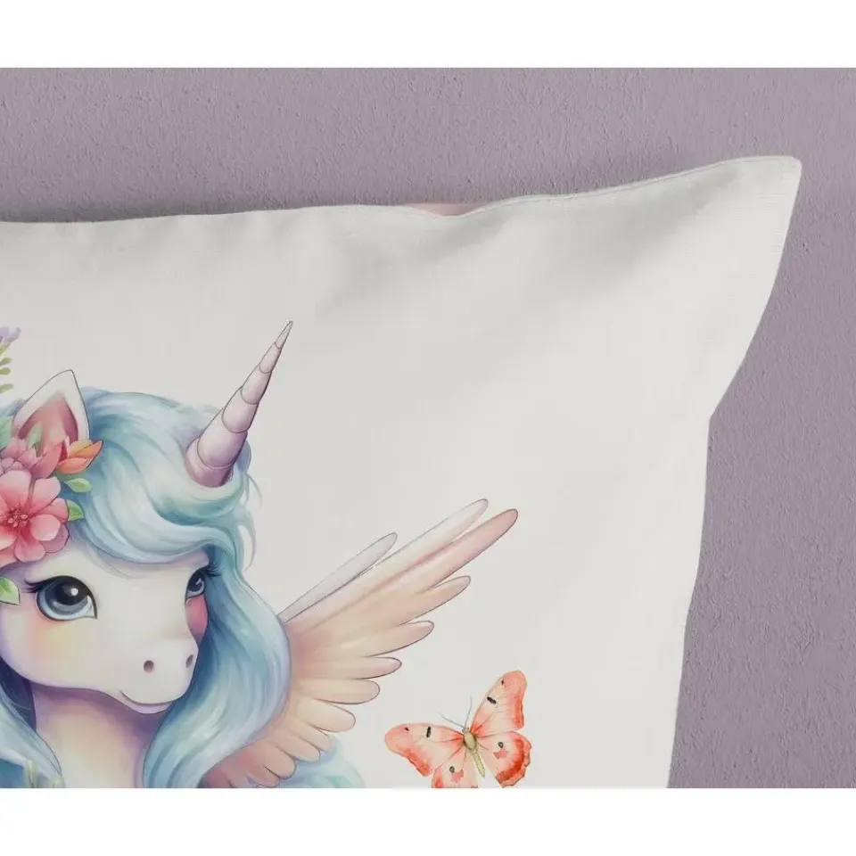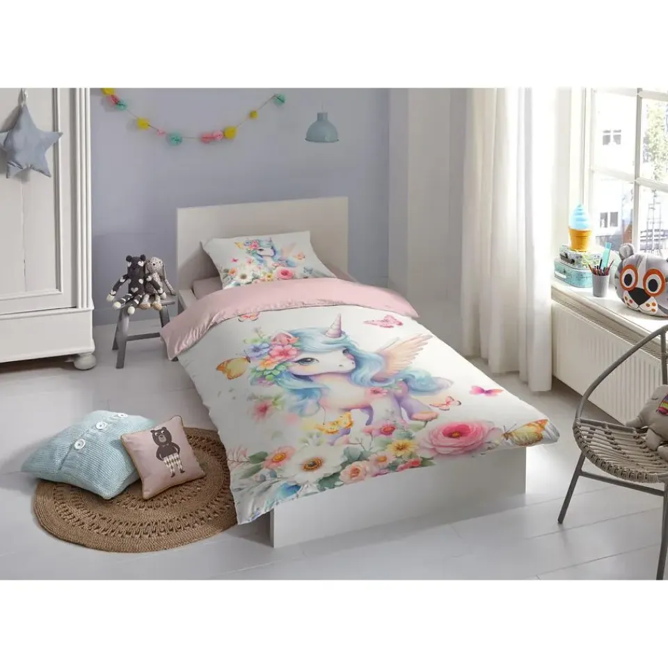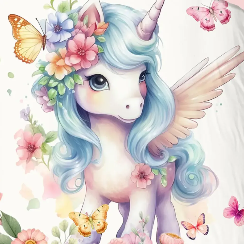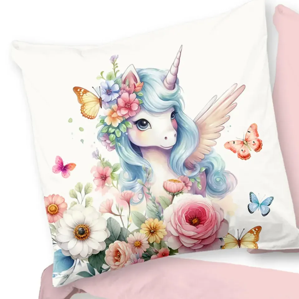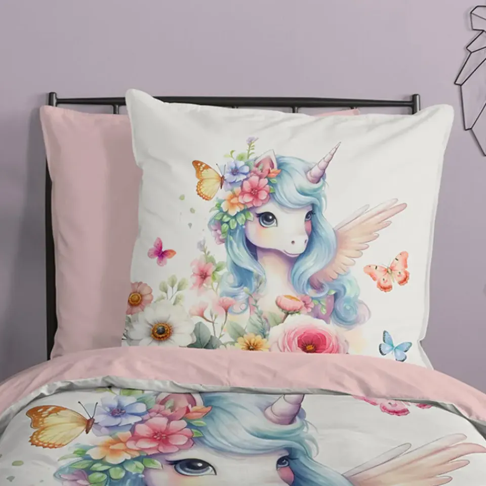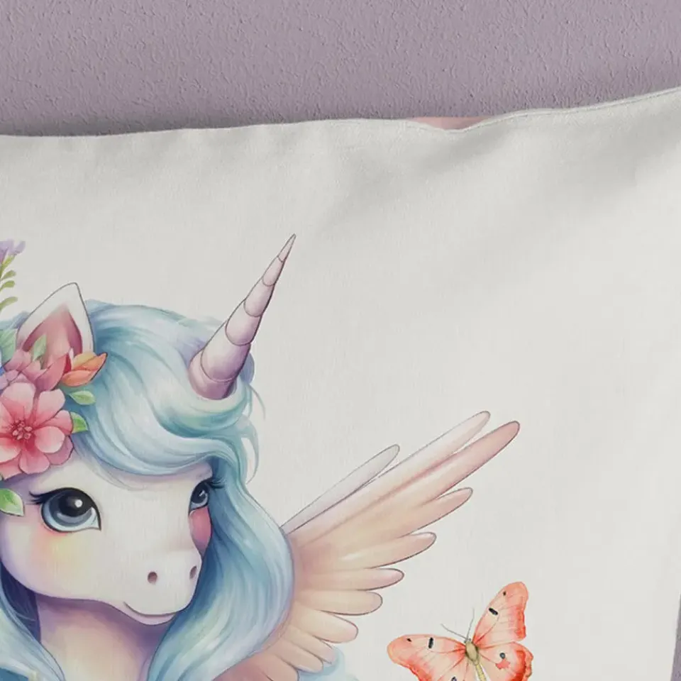 Het schattige eenhoornontwerp met zachte pastelkleuren, bloemen en vlinders spreekt tot de verbeelding van elk kind. De zachte roze achtergrond brengt rust, terwijl de vrolijke print zorgt voor een dromerige, magische sfeer. Ideaal als cadeau of om de kinderkamer op te vrolijken!