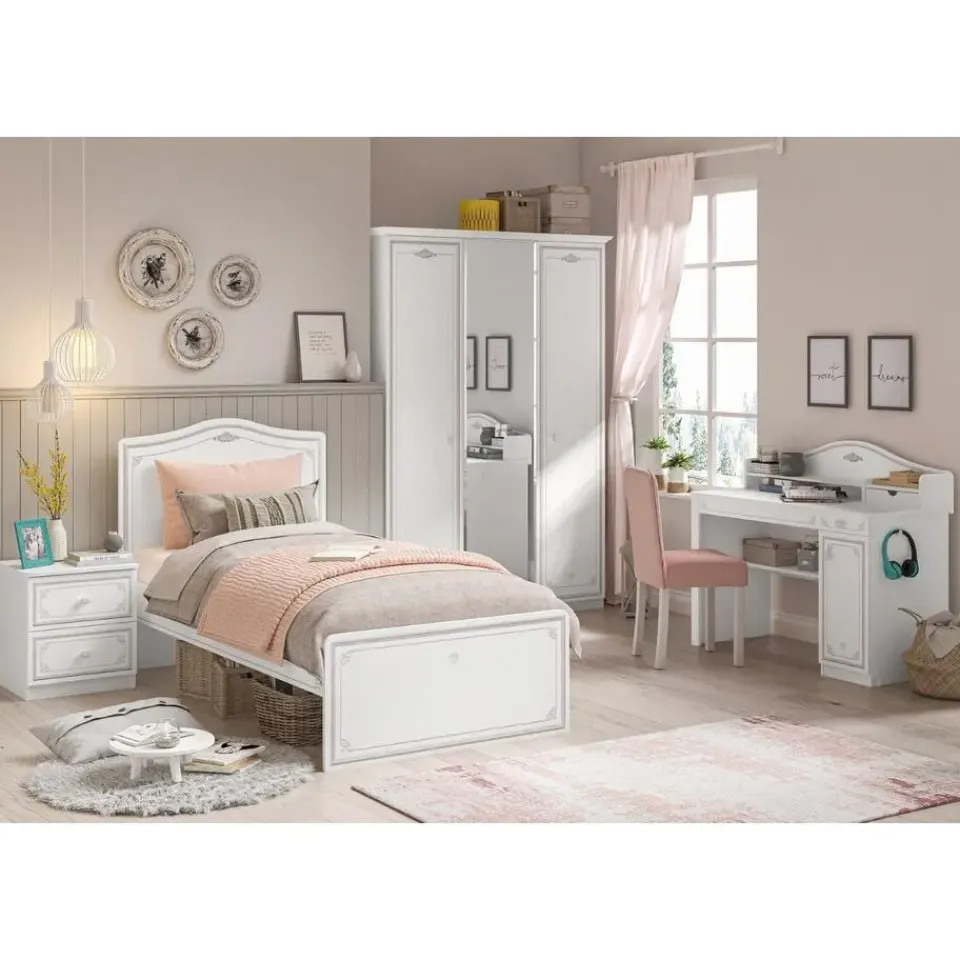Het Emily meisjesbed is kwalitatief zeer goed afgewerkt en heeft sierlijke details. Optioneel kunt u een bedlade er bijbestellen. Deze kan dienen als logeerbed of als opberglade voor spullen. De sierlijke roze decoratie is op het bed gelaserd. De Emily meisjeskamer heeft sierlijke witte meubels met prachtige grijze details.