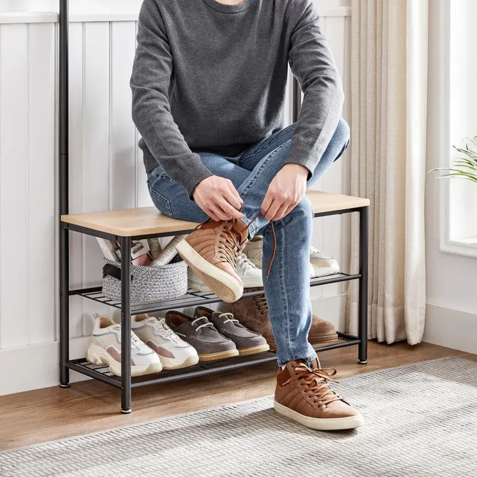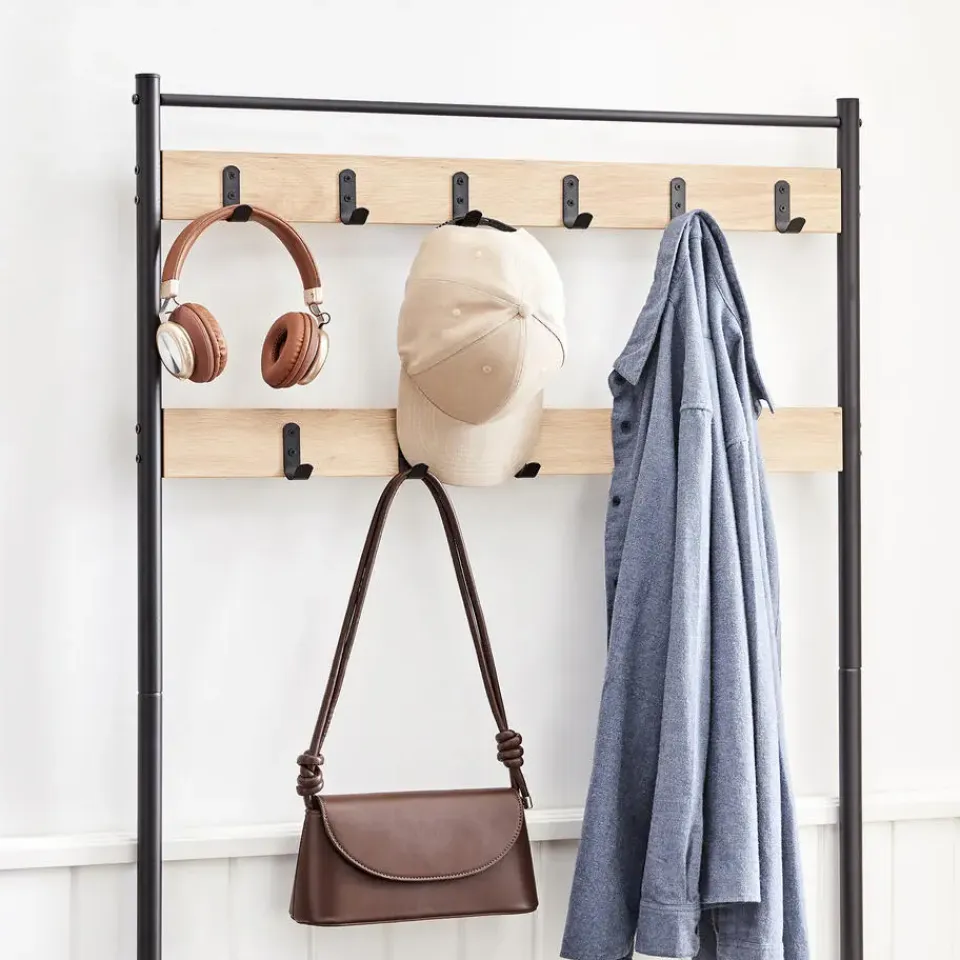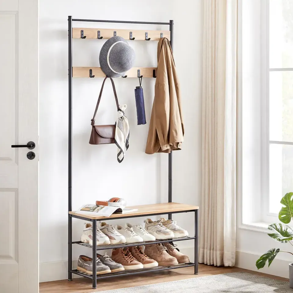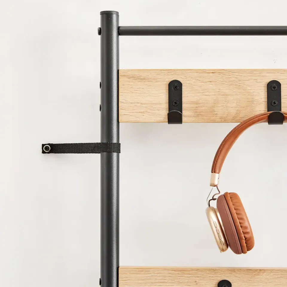 Trendy, praktisch én origineel, het zijn slechts enkele kenmerken van dit multifunctioneel garderoberek. De kleurencombinatie van lichte eik en zwart, zorgt voor een warme en uitnodigende look. Het garderoberek beschikt over 11 haken. Meer dan voldoende ruimte dus voor jouw jassen, tassen of sjaals. En dat is nog niet alles! Er is ook een schoenenrekje waarop je zo’n 8 paar schoenen kan zetten. Wij zijn er zeker van: dit garderoberek is een must-have in de inkomhal!