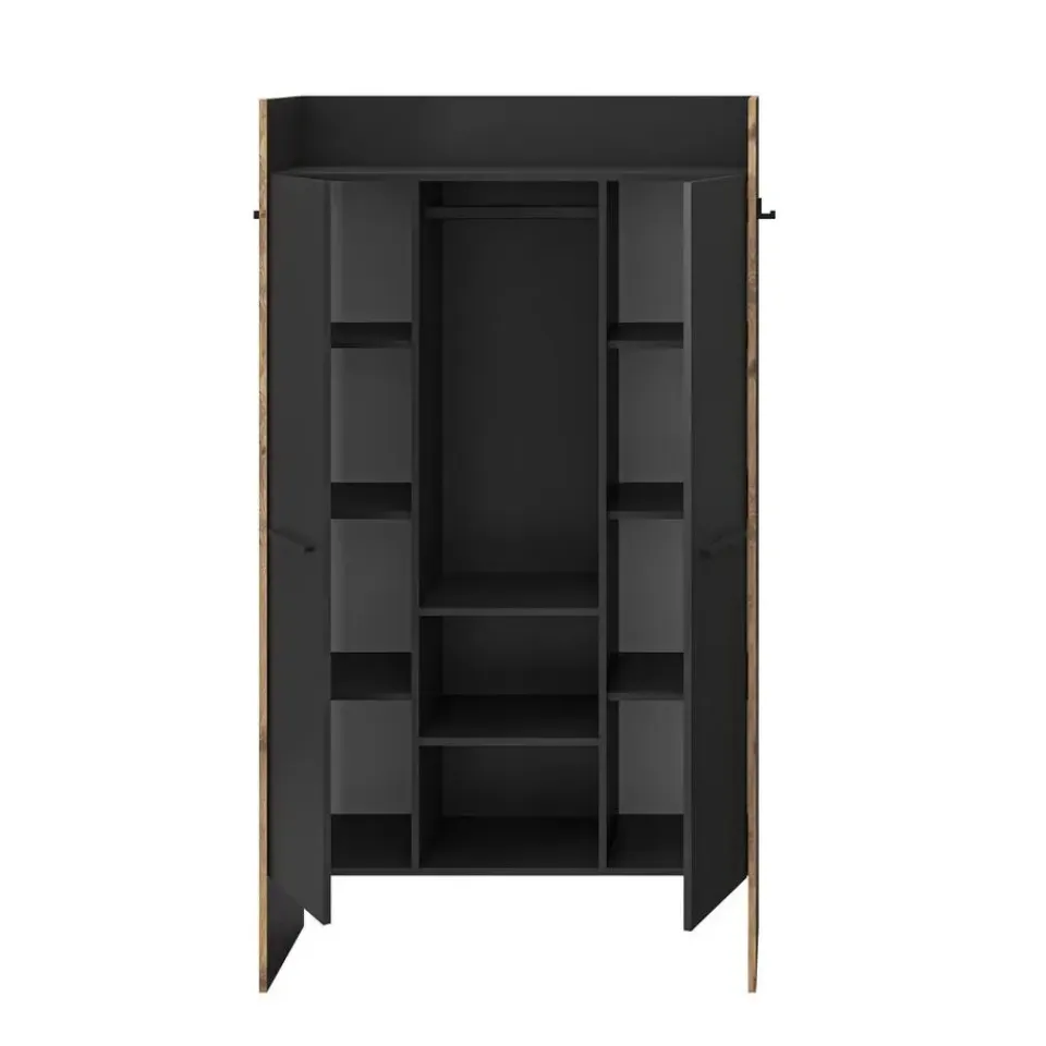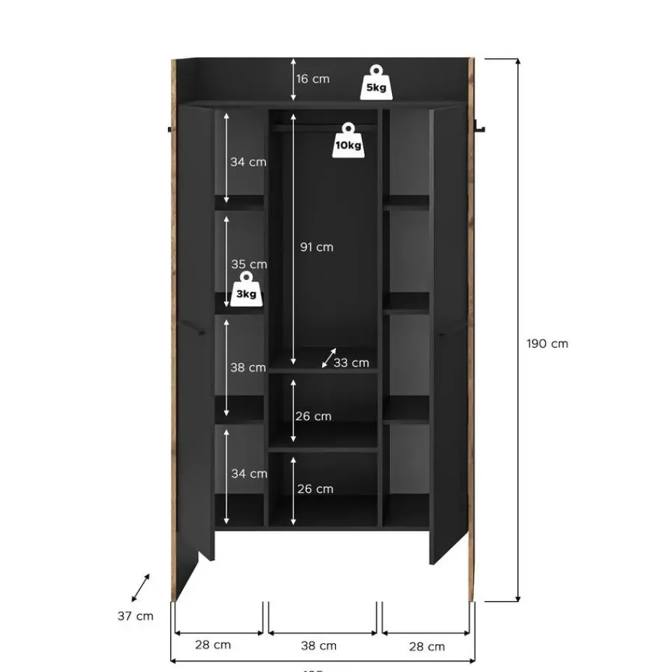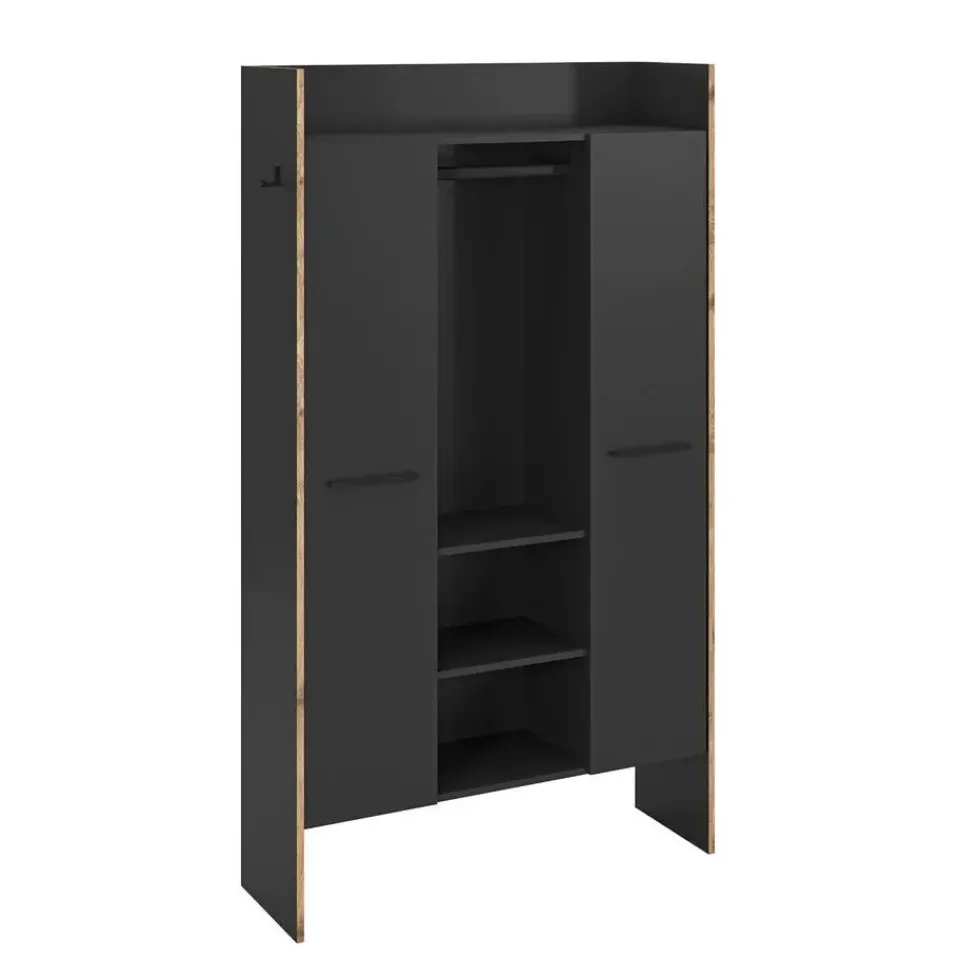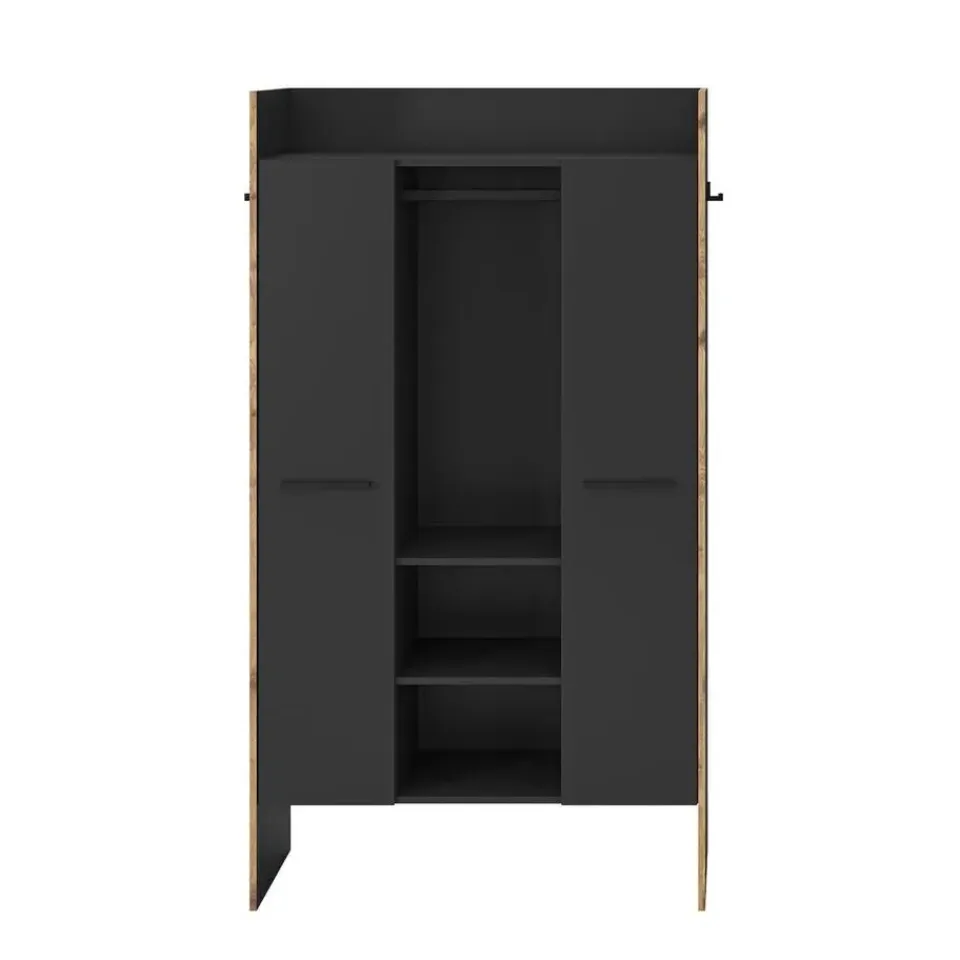 Bueno kledingkast 2 deuren, 1 lade, 3 planken en 2 haken donkergrijs. Aantal haken: 2. Aantal paar schoenen: 16. Deze kledingkast biedt de perfecte combinatie van functionaliteit en stijl en organiseert en verfraait uw gang optimaal. Stelt u zich eens voor dat u elke dag begint met een opgeruimd en uitnodigend huis – deze kledingkast maakt het mogelijk. Hij is gemaakt van hoogwaardig basaltmelamine en overtuigt door zijn moderne uitstraling en duurzaamheid. Met afmetingen van 105 x 189 x 37 cm biedt hij dankzij de praktische hangroede en twee deuren die alles netjes verbergen, voldoende ruimte voor uw kleding. De geïntegreerde zitting kan tot 90 kg dragen en nodigt u uit om u comfortabel aan en uit te kleden. Of het nu gaat om jassen, mantels of schoenen – deze kledingkast brengt orde in uw gang, slaapkamer of kledingkast. Vertrouw op kwaliteit en een doordacht ontwerp dat al vele tevreden klanten heeft overtuigd. Wacht niet langer en creëer vandaag nog uw nieuwe opberghulp voor een mooi huis! Met afmetingen van 70 x 189 x 37 cm past de kledingkast ook perfect in kleine gangen of nissen. Of u nu ’s ochtends snel uw jas aantrekt of ’s avonds uw schoenen verwisselt: dit meubelstuk ondersteunt u betrouwbaar in uw dagelijks leven.
