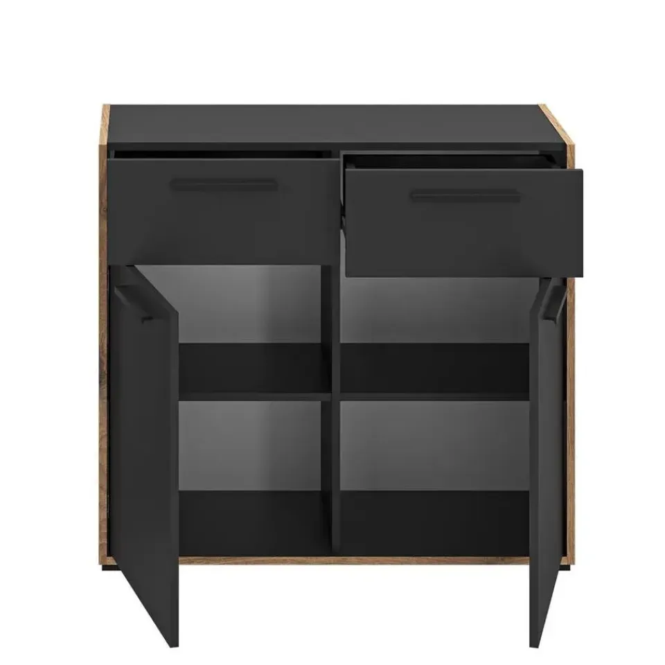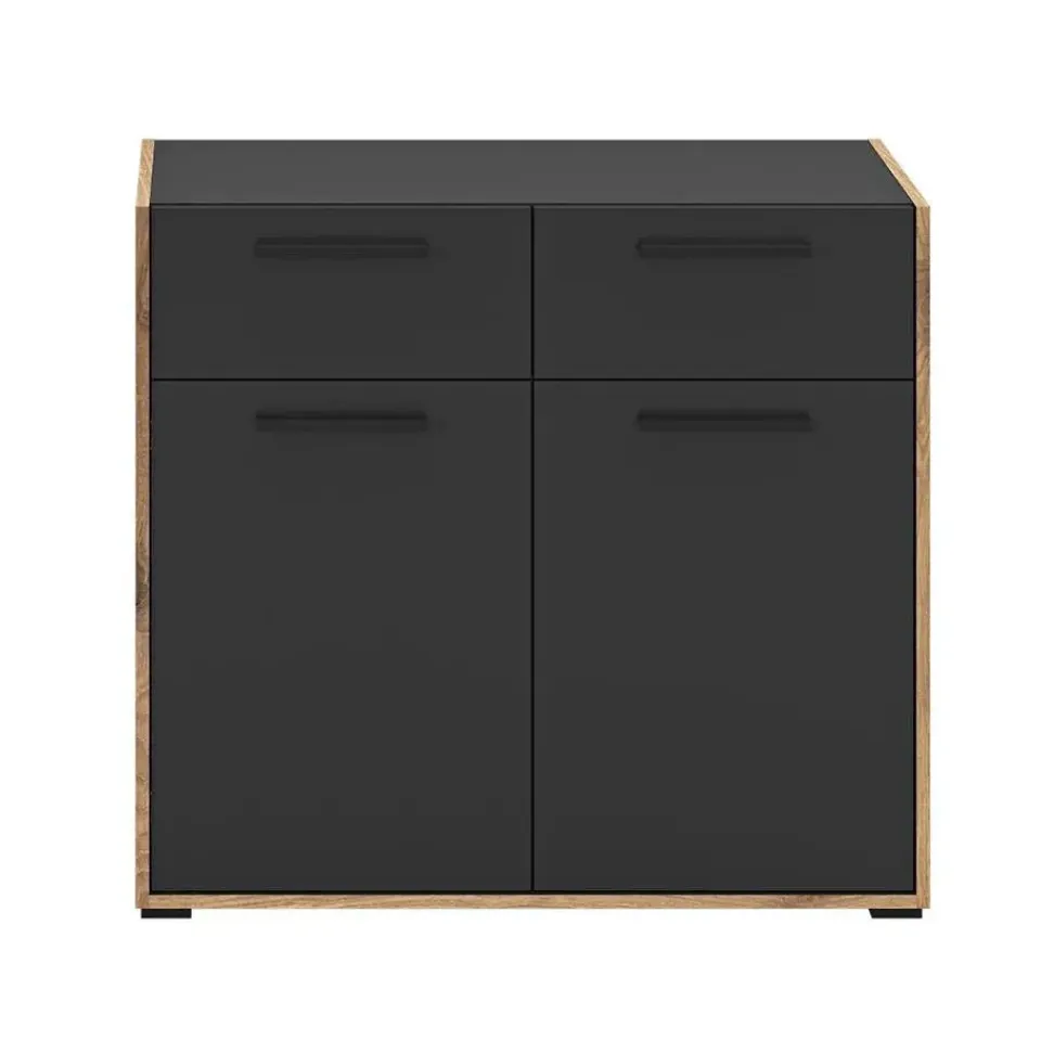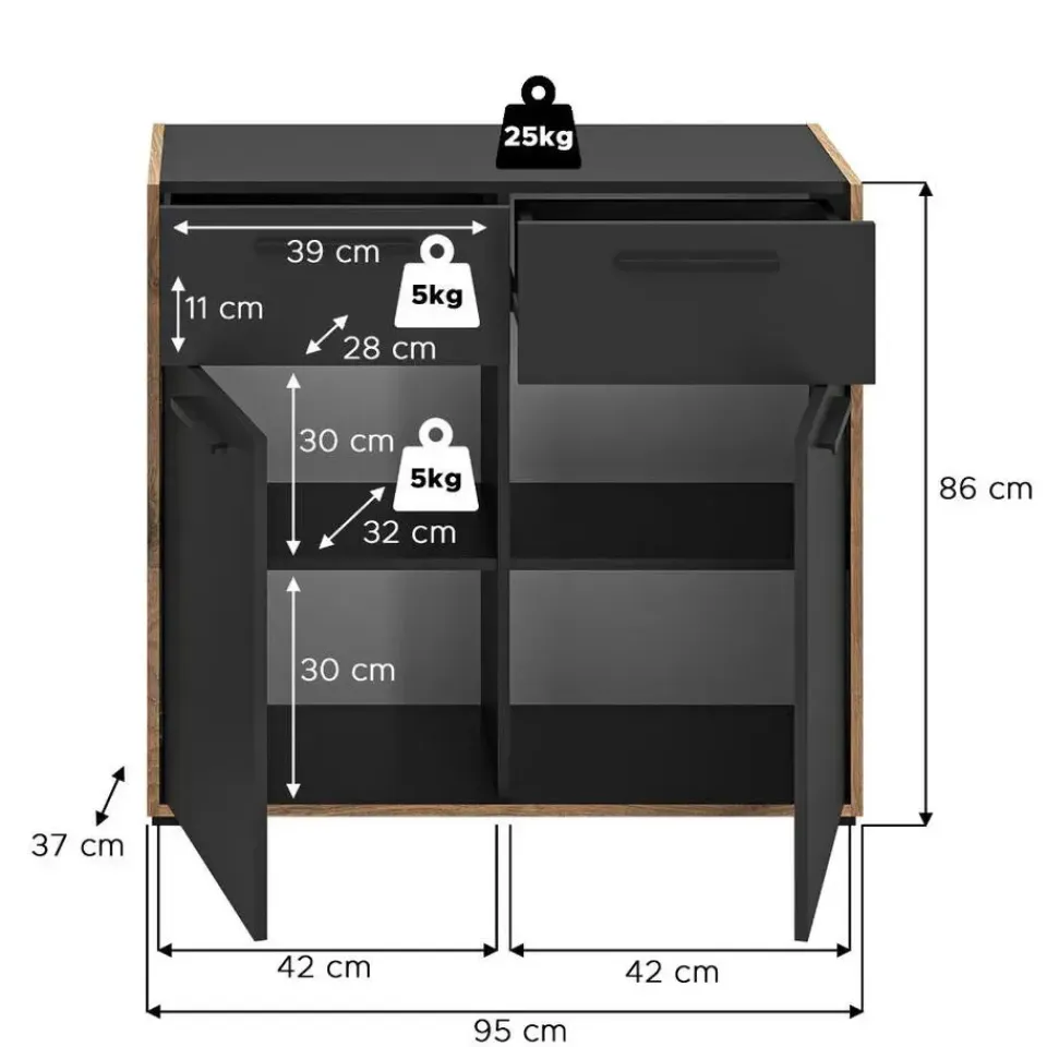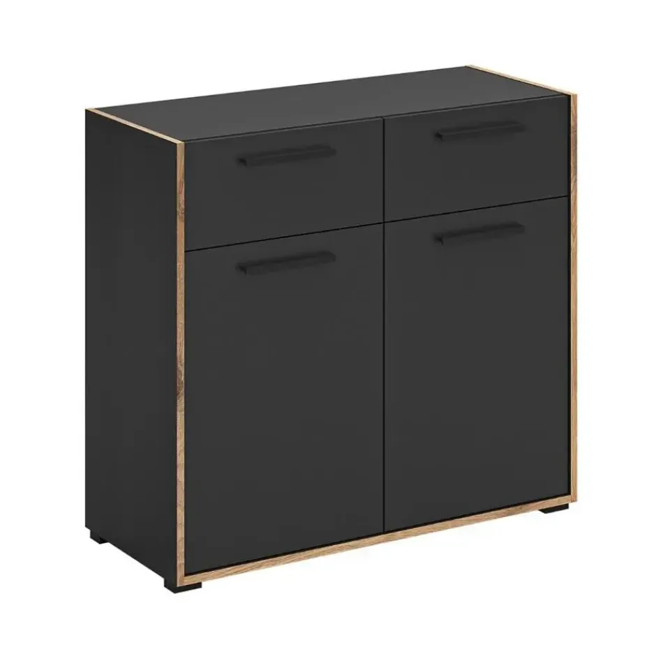 Bueno kommode 2 deuren, 2 lades donkergrijs. Aantal paar schoenen: 8. Lade met volledig uittrekbare lade. Deze ladekast biedt niet alleen voldoende opbergruimte, maar brengt ook meer orde en overzicht in uw huis – waardoor uw dagelijks leven merkbaar gemakkelijker en comfortabeler wordt. Stelt u zich eens voor hoe dit stijlvolle meubelstuk elegantie toevoegt aan uw woonruimtes en een uitnodigende sfeer creëert die uitnodigt om te blijven hangen en te ontspannen. De ladekast is gemaakt van hoogwaardig basaltmelamine en overtuigt met zijn moderne, tijdloze design en robuuste constructie. Twee lades met praktische, volledig uittrekbare geleiders bieden gemakkelijke toegang tot uw spullen, terwijl twee deuren extra opbergruimte verbergen. De onderhoudsvriendelijke oppervlakken zijn gemakkelijk te reinigen en zorgen ervoor dat de ladekast ook bij dagelijks gebruik netjes blijft. Met een breedte van 95 cm, een hoogte van 86 cm en een diepte van 37 cm past hij perfect in verschillende kamers – of het nu in de woonkamer, slaapkamer of hal is. Gebruik de lades voor kleding of kantoorbenodigdheden, de deuren voor boeken of decoratieve items, en creëer een opgeruimde omgeving die uw persoonlijke stijl weerspiegelt.
