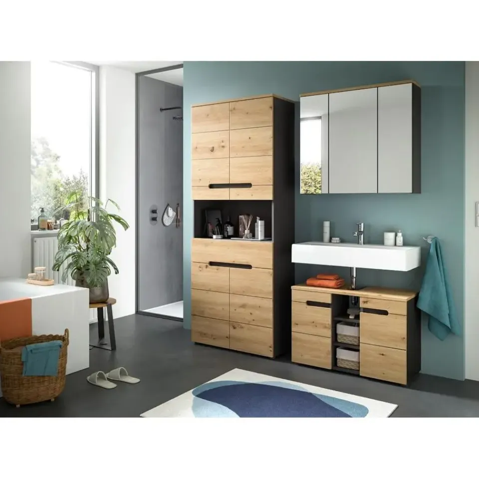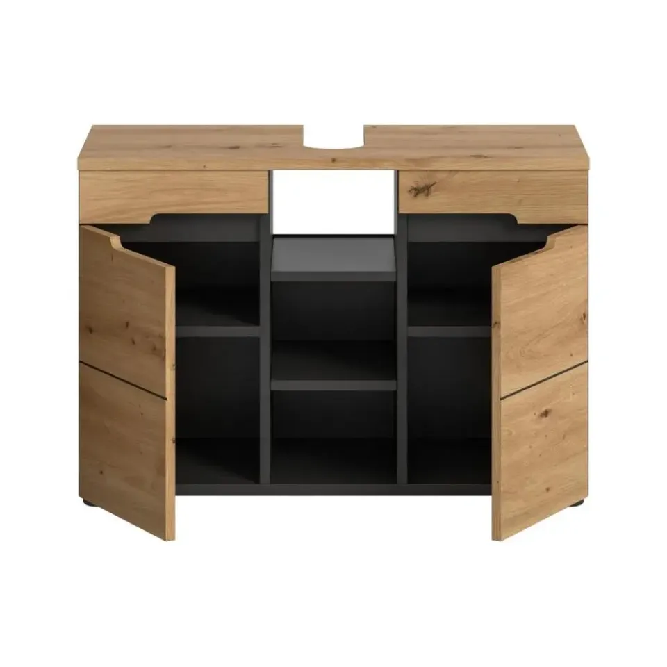 Canu wastafel 2 deuren, 3 planken eiken decor, grijs. Zonder wastafel. Deur met Softclose. Deze wastafelmeubel (B/H/D: 80x55x34 cm) overtuigt door de elegante combinatie van basaltgrijs en handgemaakte houtdecors. Met zijn moderne en tijdloze design past dit meubelstuk harmonieus in elke badkamer. De zwarte binnenkant vormt een geraffineerd contrast met de realistische houtstructuur. Deze wastafelmeubel biedt extra ruimte met verticale scheidingswanden aan beide zijden, waardoor u uw badkamerartikelen optimaal kunt organiseren. De twee deuren met geïntegreerde, verzonken handgrepen zorgen voor een minimalistische, naadloze look en maken de kast tot een visueel hoogtepunt. Het meubel is gemaakt van FSC®-gecertificeerd houtmateriaal, wat een milieuvriendelijke en duurzame productie garandeert. Met zijn compacte afmetingen is deze wastafelmeubel de ideale oplossing voor moderne badkamers die functionaliteit en esthetiek combineren. Richt uw badkamer stijlvol en milieubewust in met deze hoogwaardige wastafelmeubel!