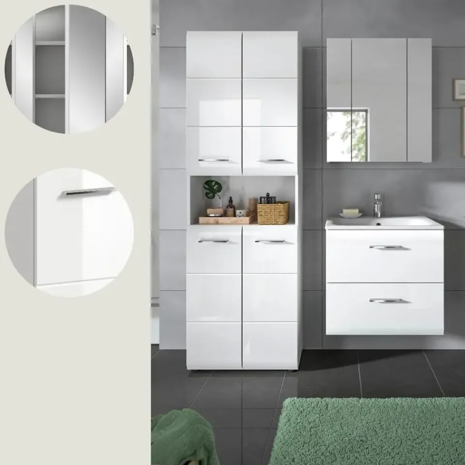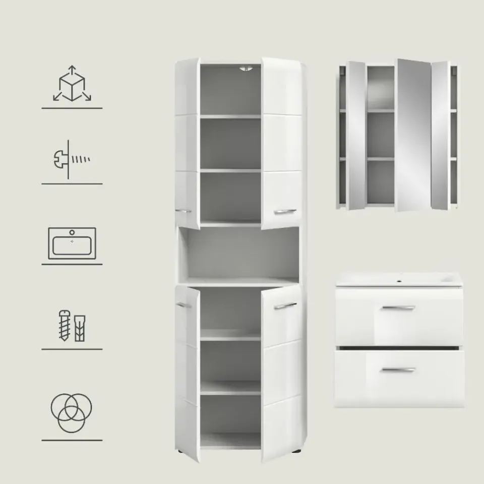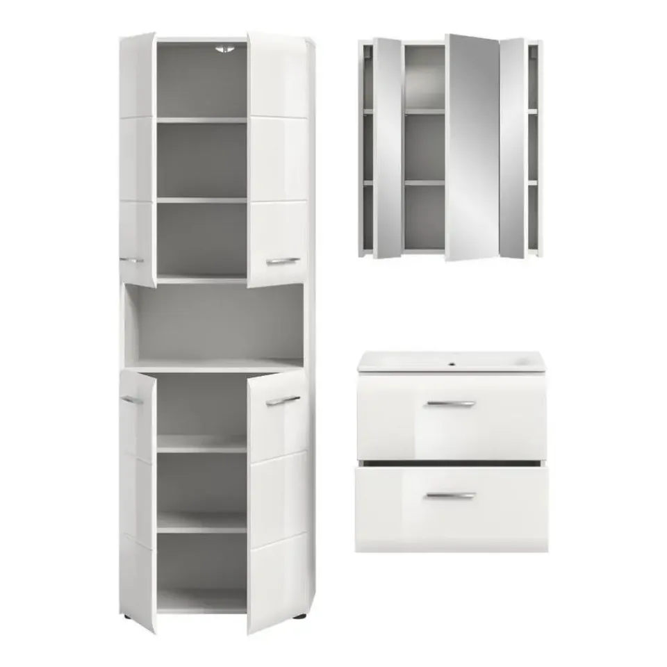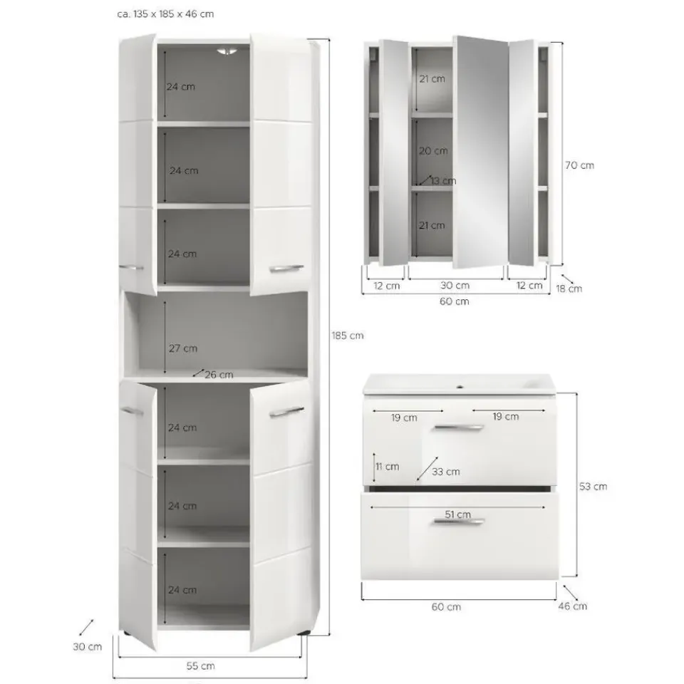 Ice badkamer wit hoogglans, wit. Incl. wasbak. Zonder armatuur. Lade volledig uittrekbaar. Ontdek de ideale oplossing voor uw badkamer met onze stijlvolle 3-delige wastafelmeubel! De set bestaat uit een brede hoge kast, een functionele wastafelmeubel met wastafel en een elegante spiegelkast. Met afmetingen van 135 x 185 x 46 cm en een afstand van 15 cm tussen de kasten biedt deze wastafelmeubel voldoende opbergruimte en een praktische organisatie van uw badkamerartikelen. De hoogwaardige MDF-fronten met moderne groefdetails geven de wastafelmeubel een moderne en aantrekkelijke uitstraling die elke badkamer een vleugje verfijning geeft. Deze wastafelmeubel is gemakkelijk schoon te maken en duurzaam, waardoor het de perfecte keuze is voor wie waarde hecht aan zowel functionaliteit als design. Transformeer uw badkamer in een stijlvolle oase met deze goed doordachte wastafelmeubel!