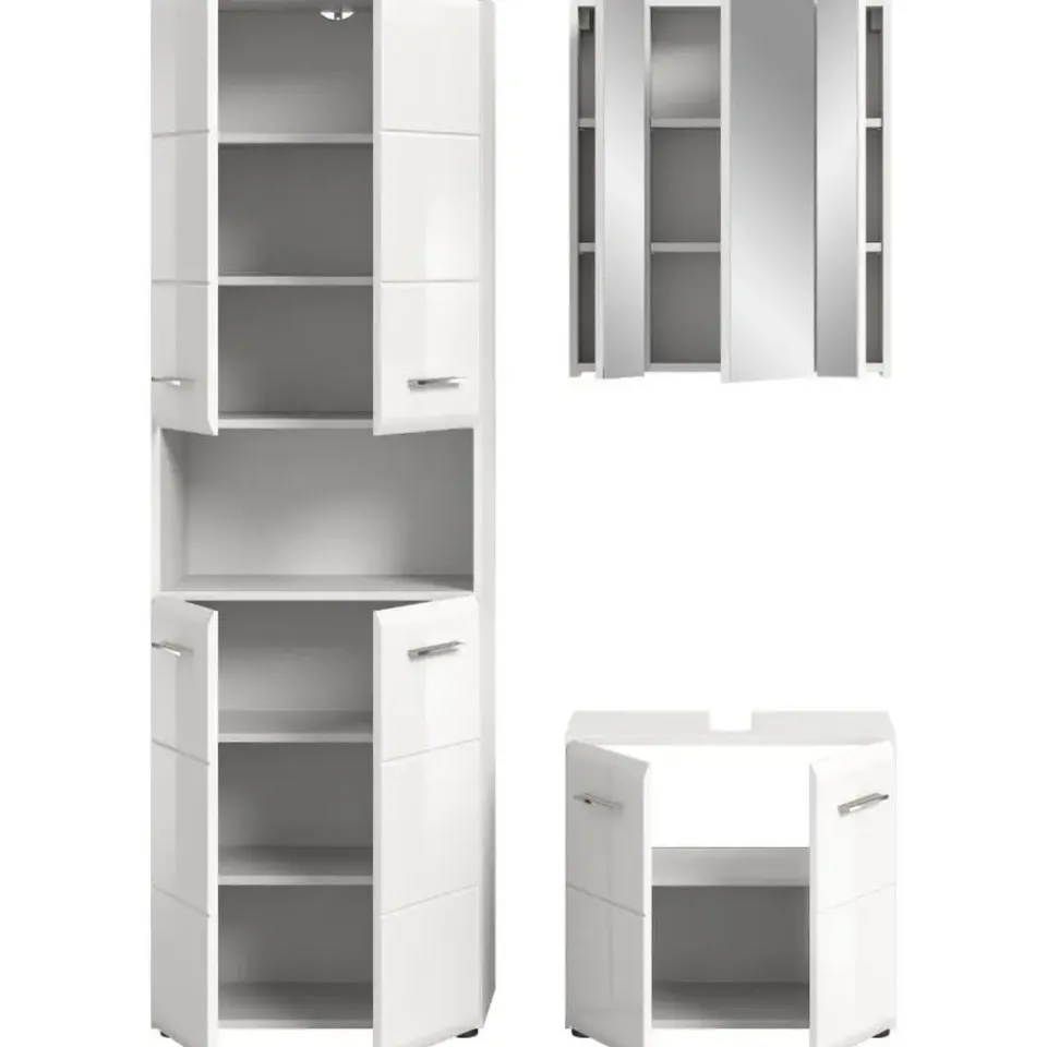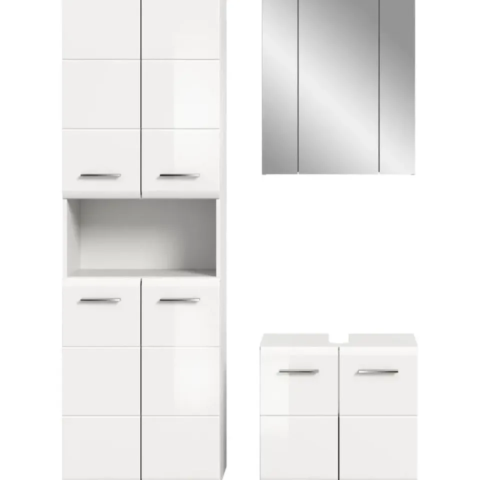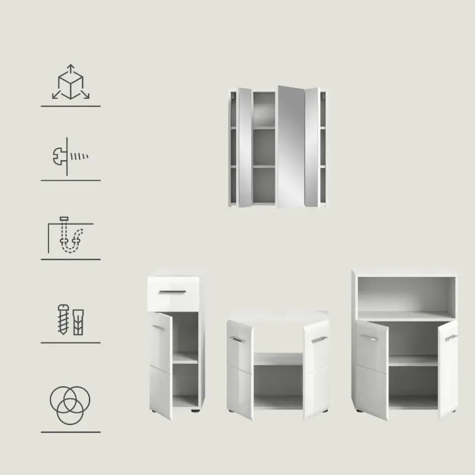 Ice badkamer wit hoogglans, wit. Zonder wasbak. Ontdek onze elegante badkamermeubelset in stralend wit, gecombineerd met hoogglanzende, diepgetrokken elementen voor tijdloze elegantie. Deze doordachte combinatie van verschillende badkamermeubels in een witte afwerking biedt niet alleen opbergruimte voor uw badkamerartikelen, maar geeft uw badkamer ook een moderne en overzichtelijke uitstraling.