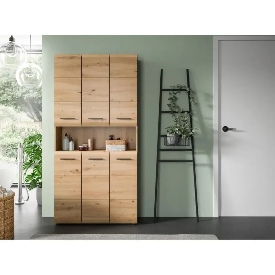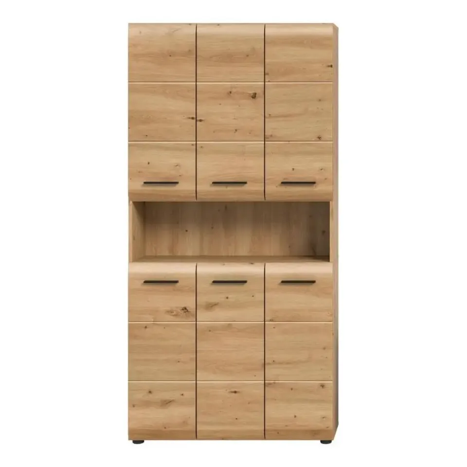 Ice badkamerkast 6 deuren, 1 plank eiken decor. Deze multifunctionele kast in Artisan Oak-afwerking biedt volop opbergruimte voor al uw badkamerbenodigdheden met zes deuren, acht in hoogte verstelbare planken, twaalf gesloten vakken, twee vaste planken en één open vak. Het hoogwaardige MDF-front met gegroefde details combineert Scandinavisch design met praktische indeling en creëert zo een harmonieuze badkamersfeer.