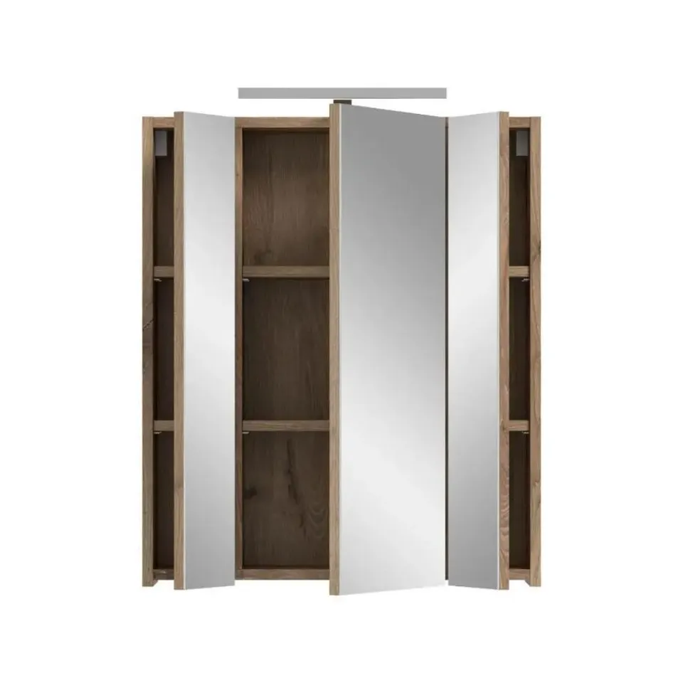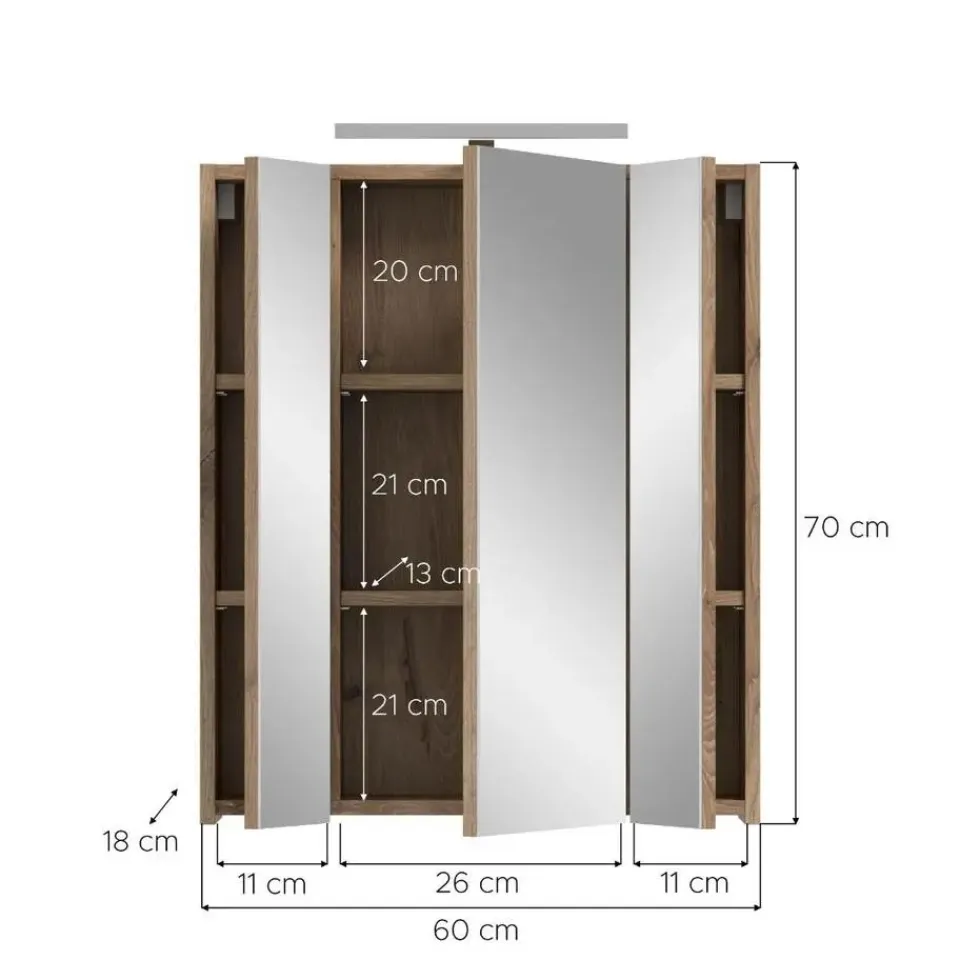 Ice spiegelkast inclusief verlichting 3 spiegeldeuren zwart mat, eiken decor. LED. 6 kWh/1000h. 400 Lumen. 4,85 Watt. 29.400 uur. Kelvin 5000. EEF: G. LED kan niet worden vervangen. Fleur je badkamer op met deze spiegelkast in matzwart en Nox Oak, compleet met opbouwlamp. Vier spiegeldeuren en negen compartimenten bieden volop opbergruimte en uitstekend zicht. Het hoogwaardige MDF-front met gegroefde frees combineert modern matzwart design met de natuurlijke uitstraling van Nox Oak voor een comfortabele en inspirerende badkamer.