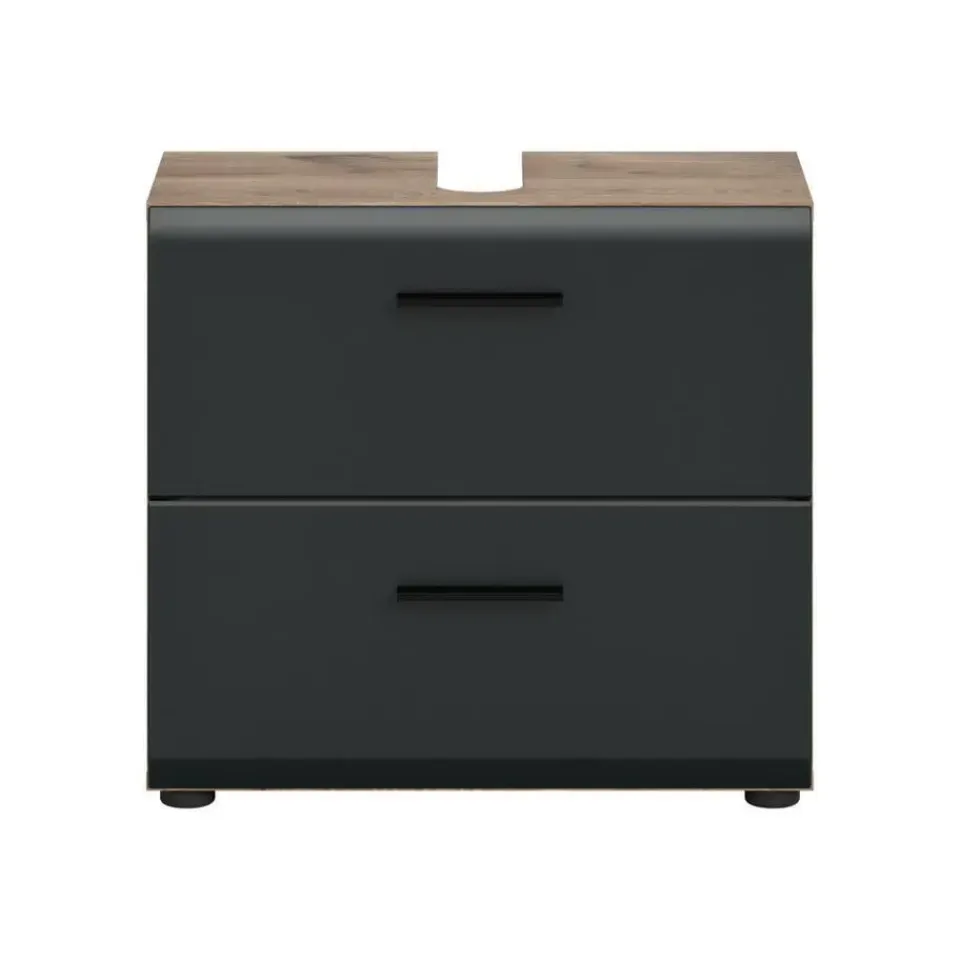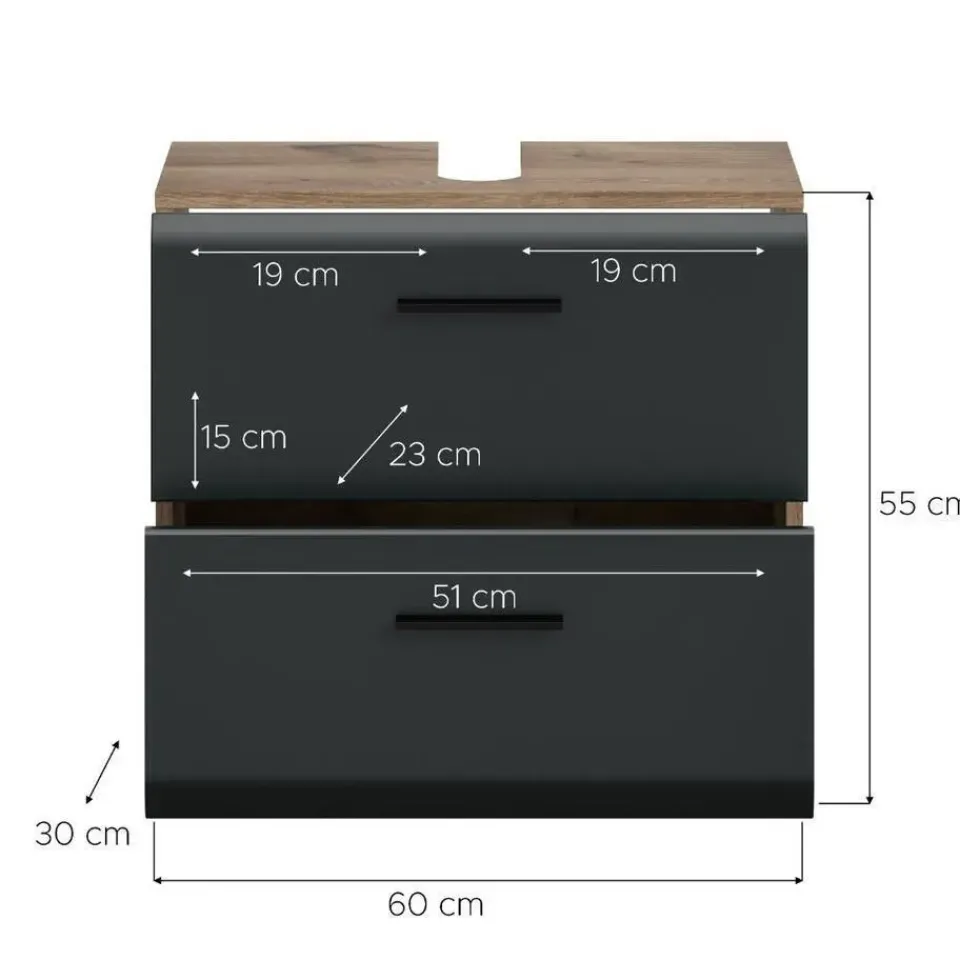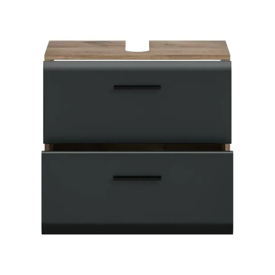 Ice wastafel 2 lades zwart mat, eiken decor. Zonder wastafel. Lade volledig uitschuifbaar. Deze wastafelmeubel met twee laden en een uitsparing voor een sifon (240×70 mm) in mat zwart en Nox Oak biedt meer opbergruimte en gebruiksgemak. Het hoogwaardige MDF-front met gegroefde frees combineert de moderne elegantie van mat zwart met de warme uitstraling van Nox Oak. Zo berg je je toiletartikelen netjes en stijlvol op.
