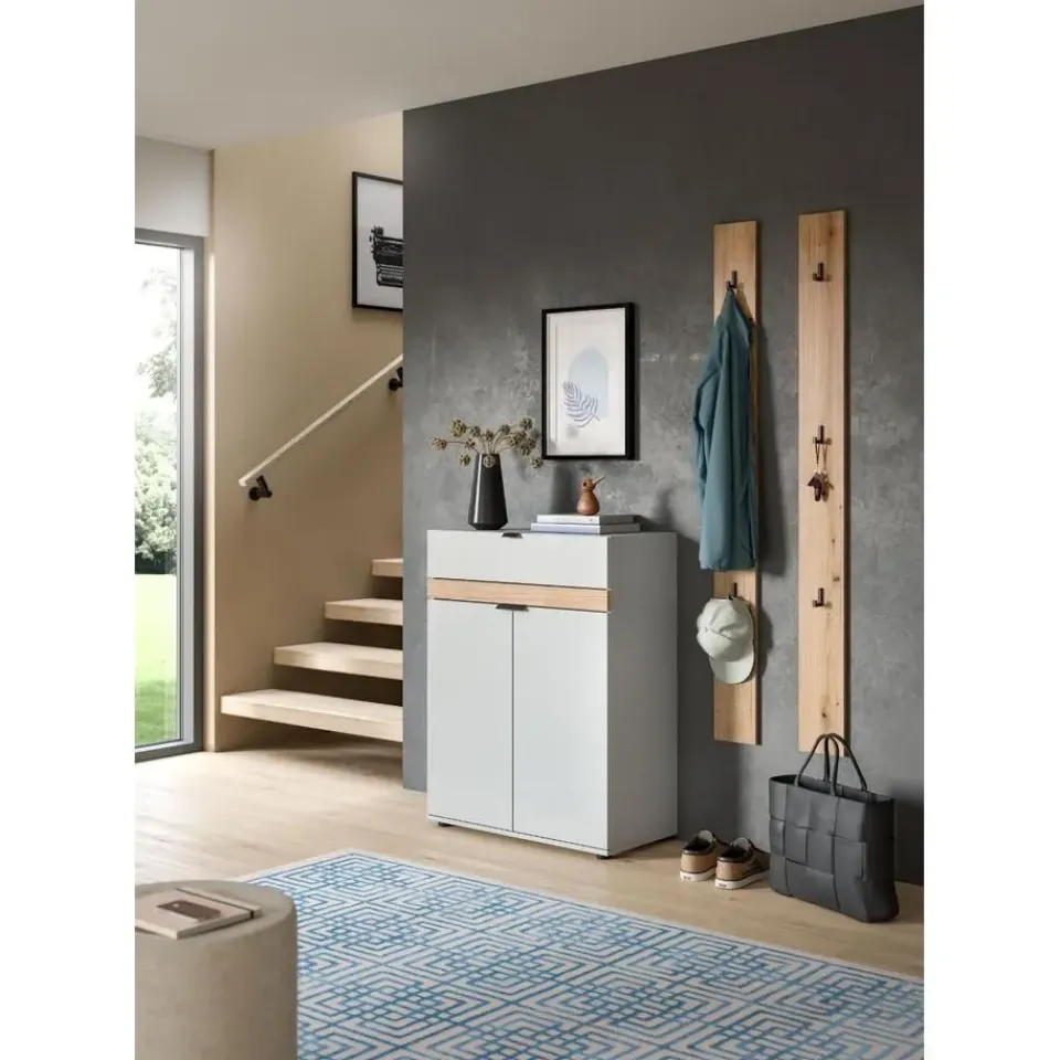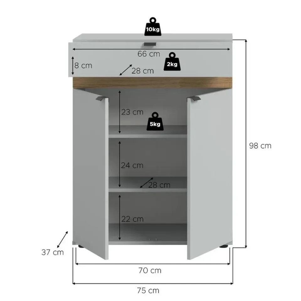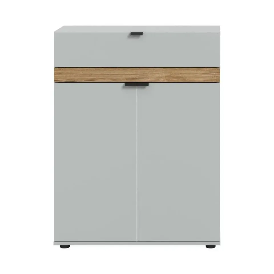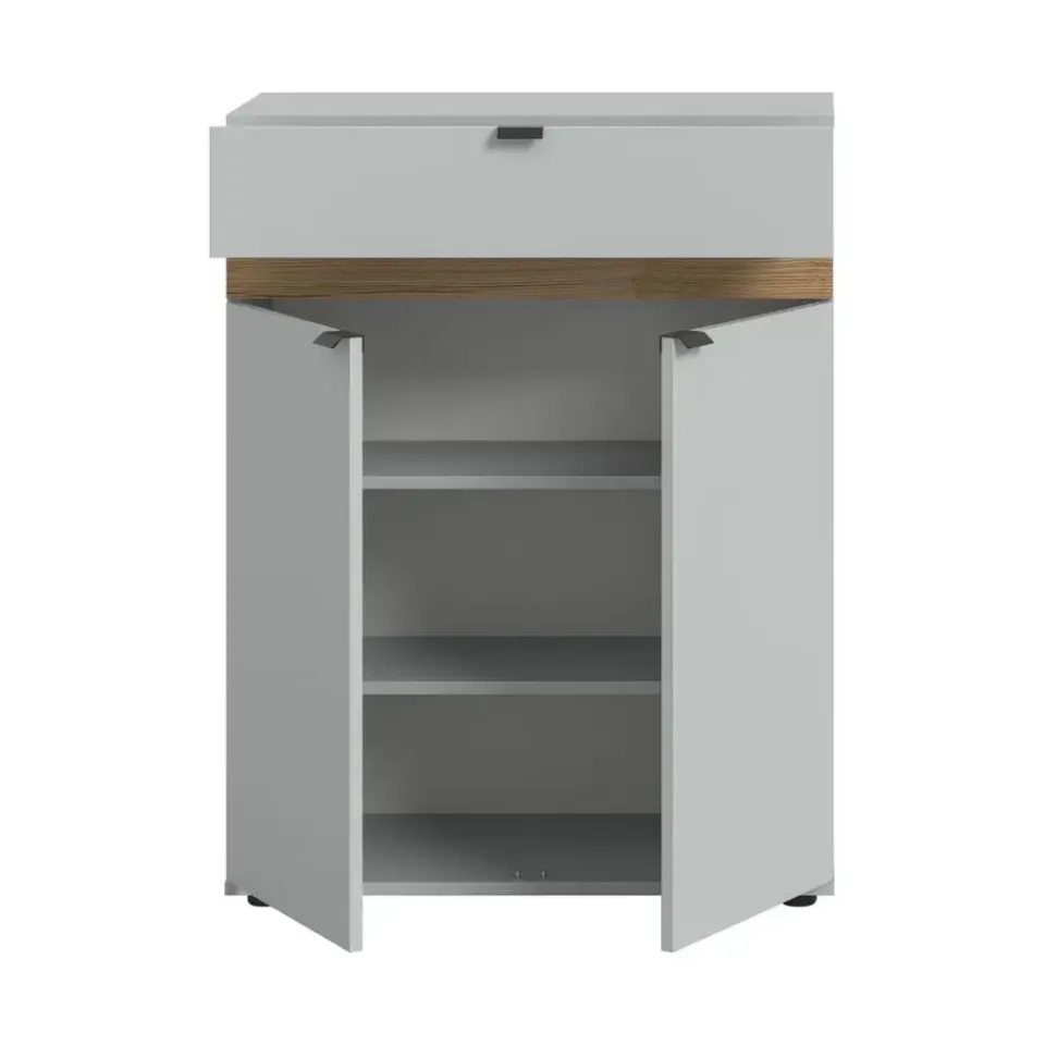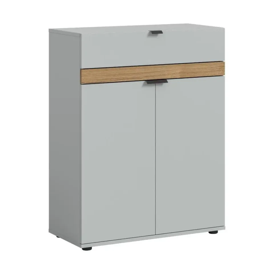 Naro schoenenkast 2 deuren, 1 lade grijs. Aantal paar schoenen: 8. Deur Softclose. Lade volledige uittrekking. Deze schoenenkast in grijze look (75 x 98 x 37 cm) biedt volop opbergruimte voor je schoenen en andere spullen met twee deuren, twee in hoogte verstelbare planken, drie gesloten vakken en een volledig uittrekbare lade. Het onderhoudsvriendelijke oppervlak zorgt voor een moderne uitstraling en eenvoudige reiniging. De kast is robuust en duurzaam en garandeert jarenlang plezier. De snelle en eenvoudige montage zorgt voor een moeiteloze inrichting van je hal. Dankzij de diverse combinatiemogelijkheden van deze serie integreer je de schoenenkast naadloos in je bestaande interieur en creëer je een stijlvolle en georganiseerde ruimte. Dit meubel combineert functionaliteit en design op perfecte wijze.